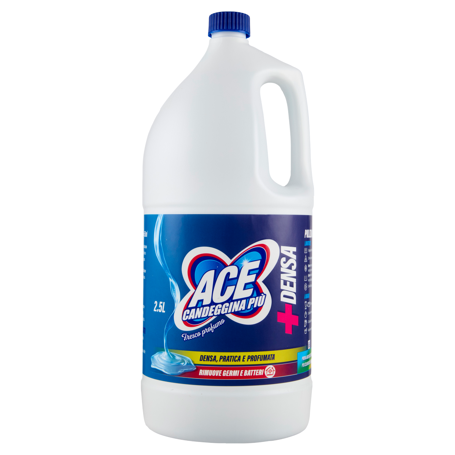 Ace Candeggina Più, con la sua formula profumata e più densa rispetto alla candeggina tradizionale, ti garantisce più controllo e un utilizzo senza schizzi.