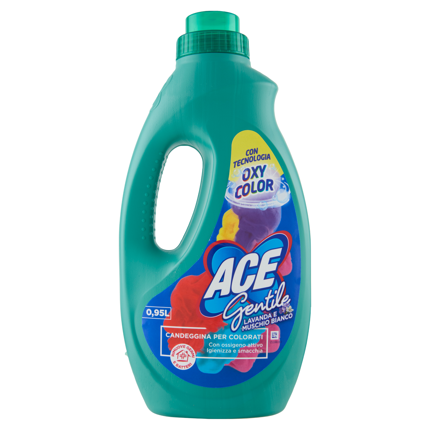 Ace Gentile è la candeggina per i colorati, studiata per essere efficace contro le macchie e sicura per i colori e i tessuti.