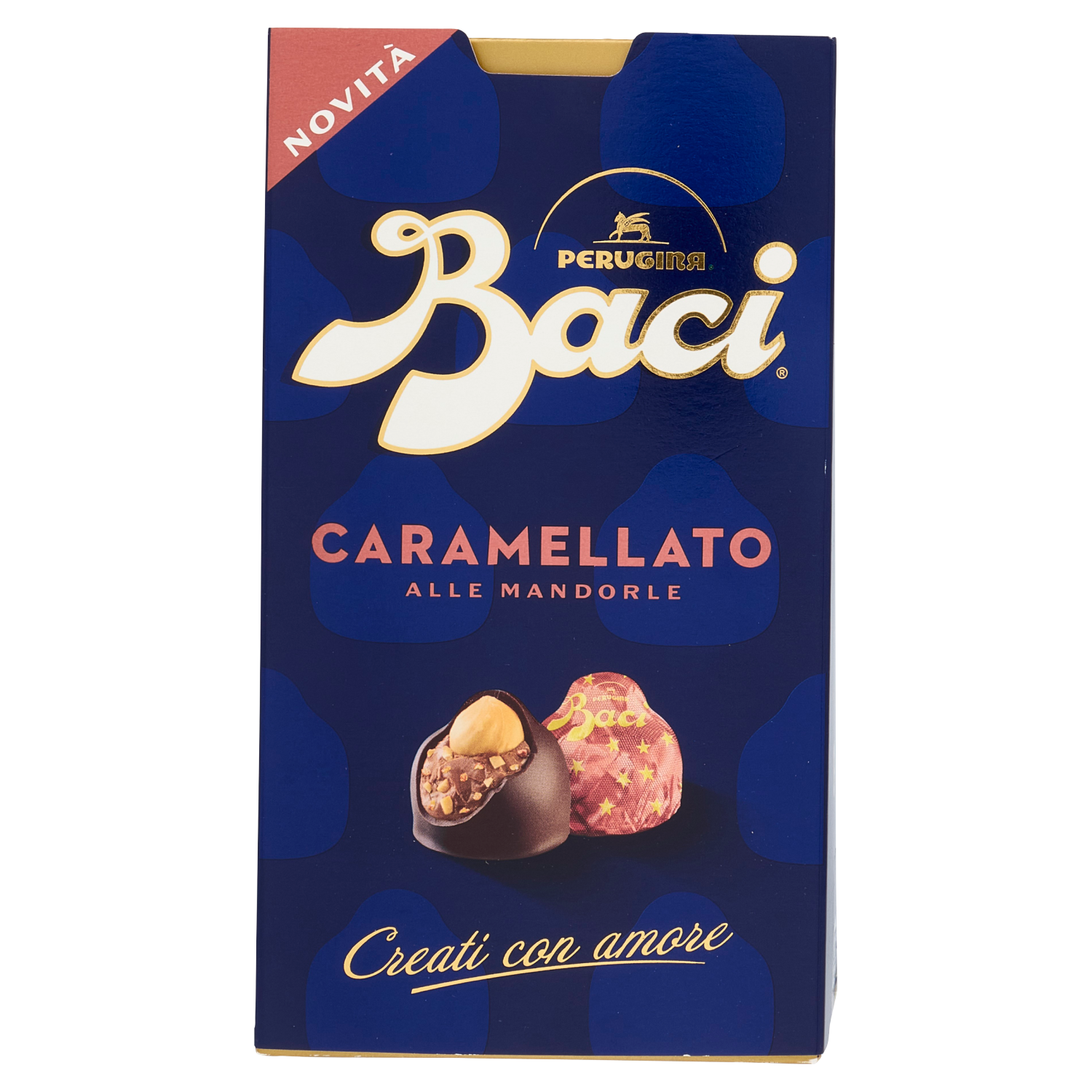 Pralina di cioccolato fondente extra al gusto di caramello ripieno con nocciole e mandorle