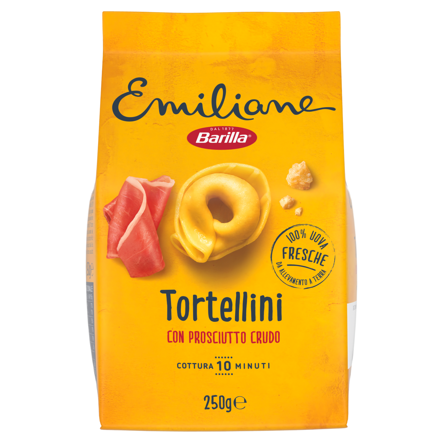 Ripieno 34% (carni suine stufate 15,3%* (carni suine, sale, zucchero, spezie), pane grattugiato (farina di grano tenero tipo "0", lievito, sale), olio di girasole, fiocchi di patate, uova fresche di categoria A 2,9%*, aromi (latte, grano), prosciutto crudo 1,3%* (cosce di suino, sale), Grana Padano DOP 0,8%* (latte, lisozima da uovo), sale, antiossidante: estratto di rosmarino)