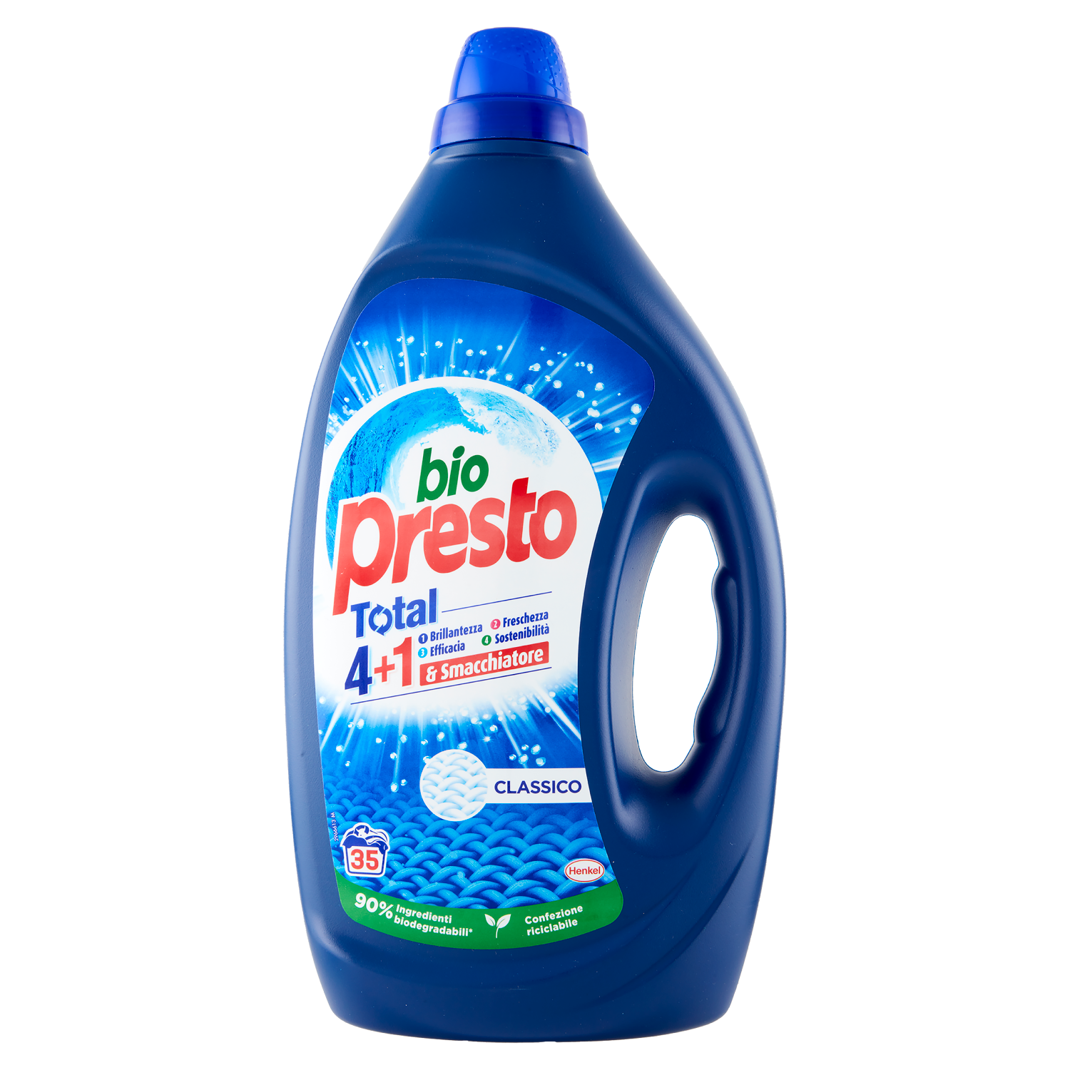 Con Bio Presto non esiste sporco impossibile, da oltre 55 anni l'alleato delle famiglie italiane contro le macchie. La sua formula innovativa Total 4+1 agisce in profondità nelle fibre per capi puliti, brillanti, freschi e senza macchie, con un'attenzione speciale all'ambiente, grazie al 90% di ingredienti biodegradabili*. Scoprilo anche nelle varianti Color, Igiene, Freschezza Floreale o nella tecnologia predosata Bio Presto Power Caps.
