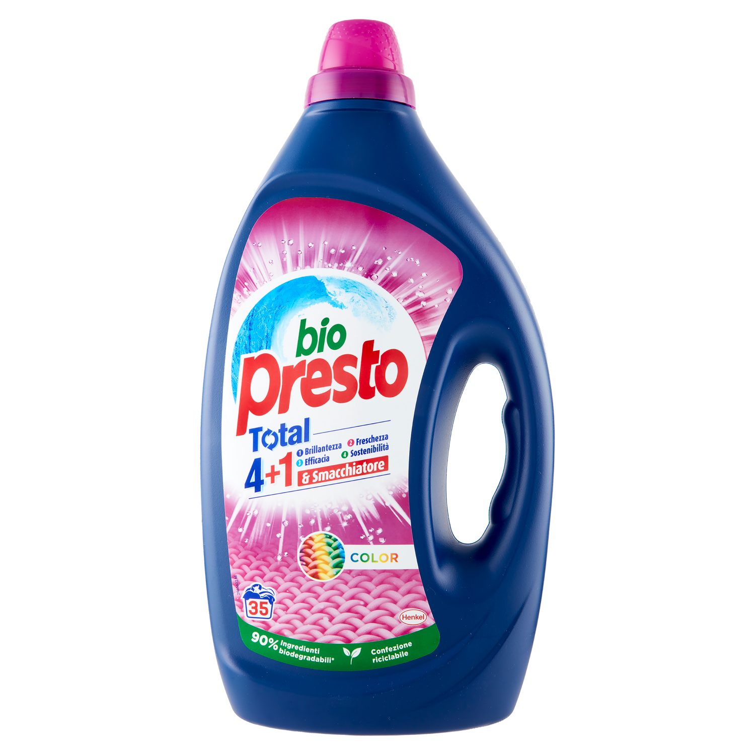 Con Bio Presto non esiste sporco impossibile, da oltre 55 anni l'alleato delle famiglie italiane contro le macchie. La sua formula innovativa Total 4+1 agisce in profondità nelle fibre per capi puliti, brillanti, freschi e senza macchie, con un'attenzione speciale all'ambiente, grazie al 90% di ingredienti biodegradabili*. Scoprilo anche nelle varianti Classico, Igiene, Freschezza Floreale o nella tecnologia predosata Bio Presto Power Caps.