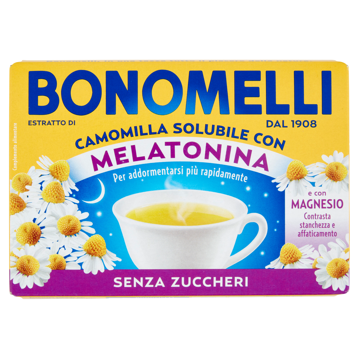 Camomilla Solubile Senza Zuccheri ottenuta da un estratto di fiori di camomilla coltivati e selezionati con cura in tutto il mondo. Bonomelli ha pensato per te questo prodotto che, oltre a conservare tutte le qualità dell'estratto di camomilla, contiene melatonina, che contribuisce alla riduzione del tempo richiesto per prendere sonno, e magnesio, che contribuisce alla riduzione della stanchezza e dell'affaticamento. L'effetto benefico della melatonina si ottiene con l'assunzione, poco prima di coricarsi, di 1 mg di melatonina.