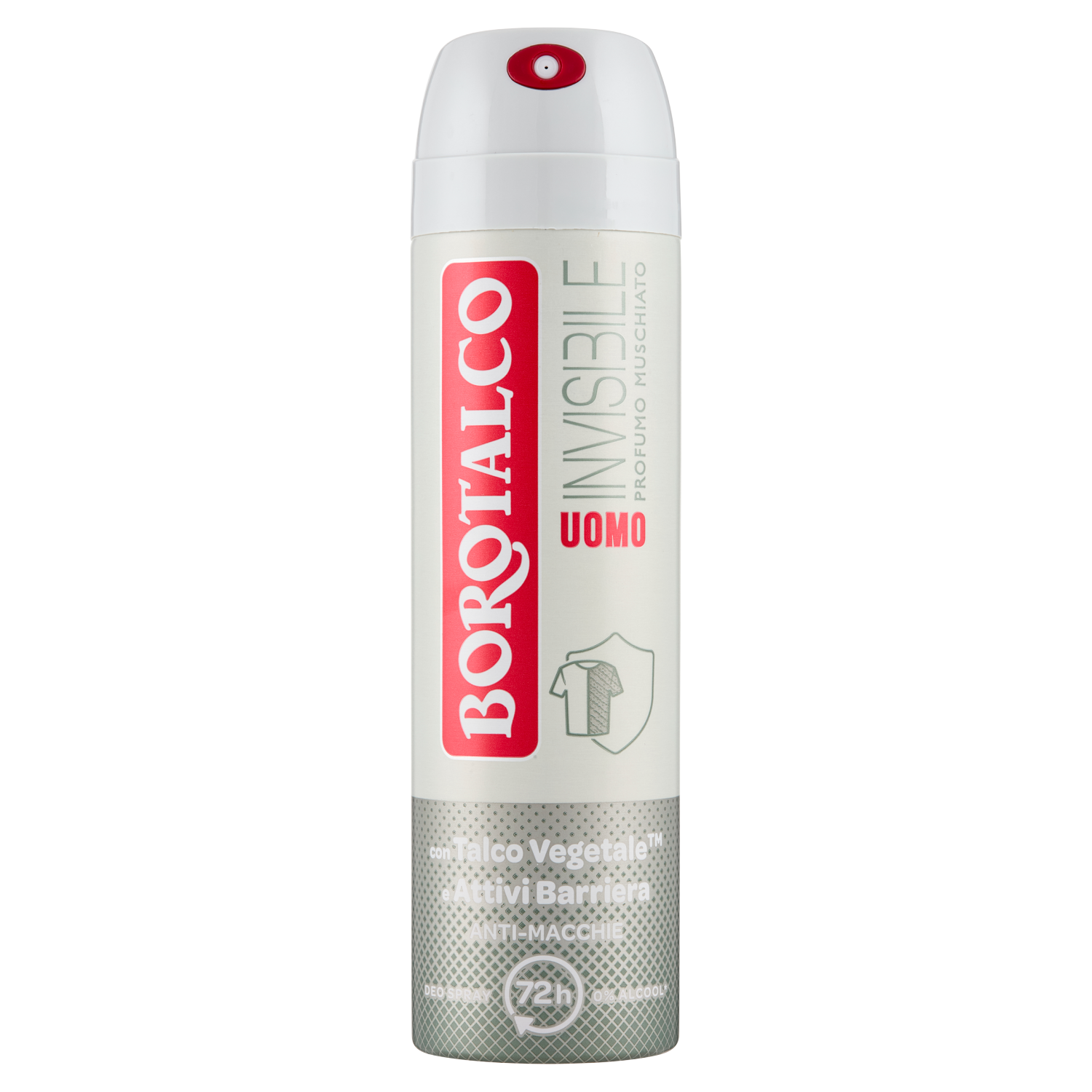 Abbraccia la nuova esperienza Borotalco Uomo! L'esclusiva formula è arricchita con Talco Vegetale, un mix di polveri assorbenti d'origine vegetale, e Attivi Barriera: una rete di molecole invisibili che cattura e non trasferisce aloni, odori e macchie sui vestiti, garantendo un effetto asciutto. Efficace su macchie bianche e gialle, anche su capi delicati come le camicie o le giacche. Efficacia deodorante 72h. 0% alcool.* Dermatologicamente testato.