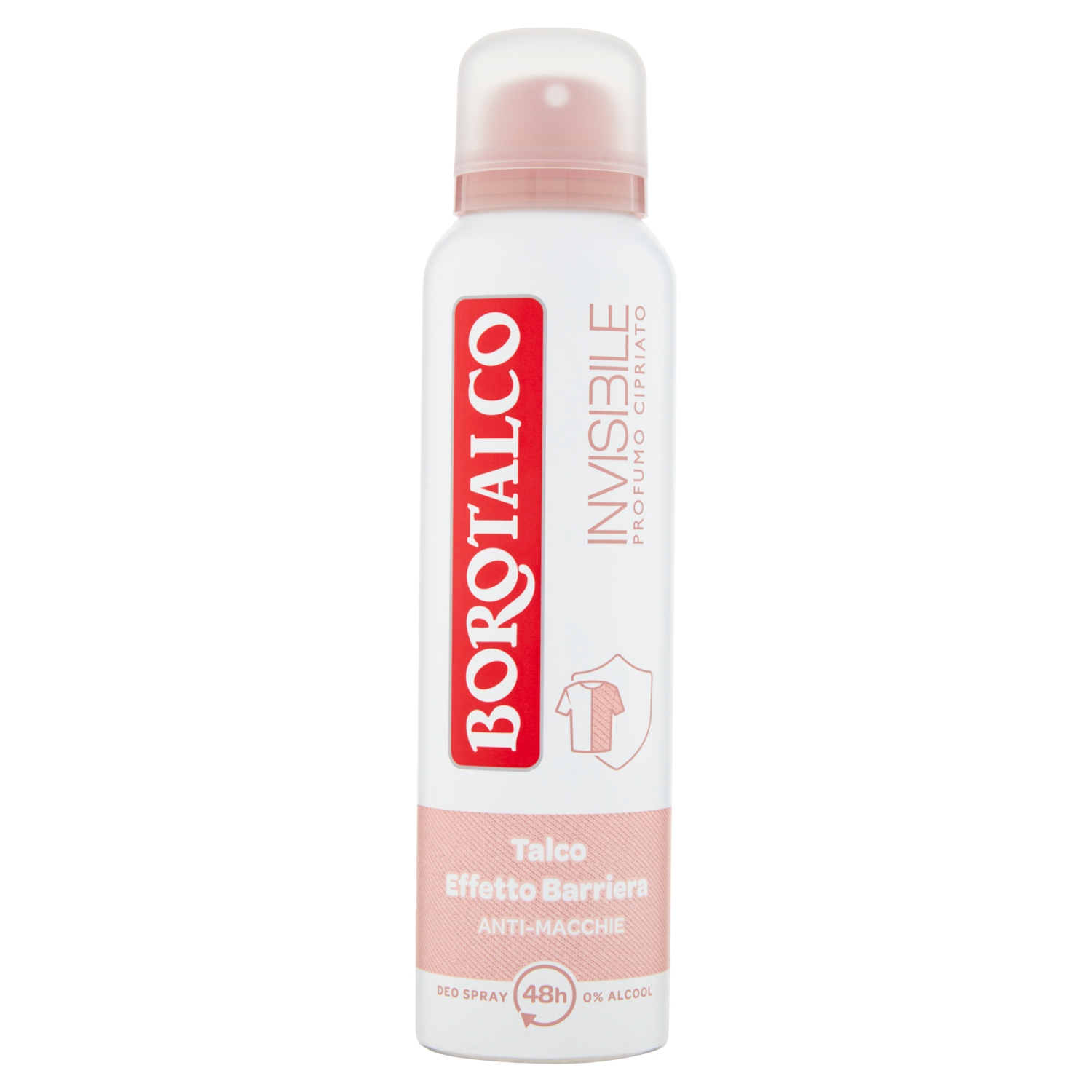 Prova tutta l'efficacia di Borotalco Invisibile con formula Talco Effetto Barriera. Lo speciale mix unisce sapientemente la protezione asciutta della polvere di Talco con una rete di molecole invisibili che cattura e non trasferisce aloni, odori e macchie, creando un effetto barriera tra pelle e vestiti per un asciutto anti-macchie. 48h di efficacia contro odori e aloni. Efficace su macchie bianche e gialle, anche su capi delicati come la seta.