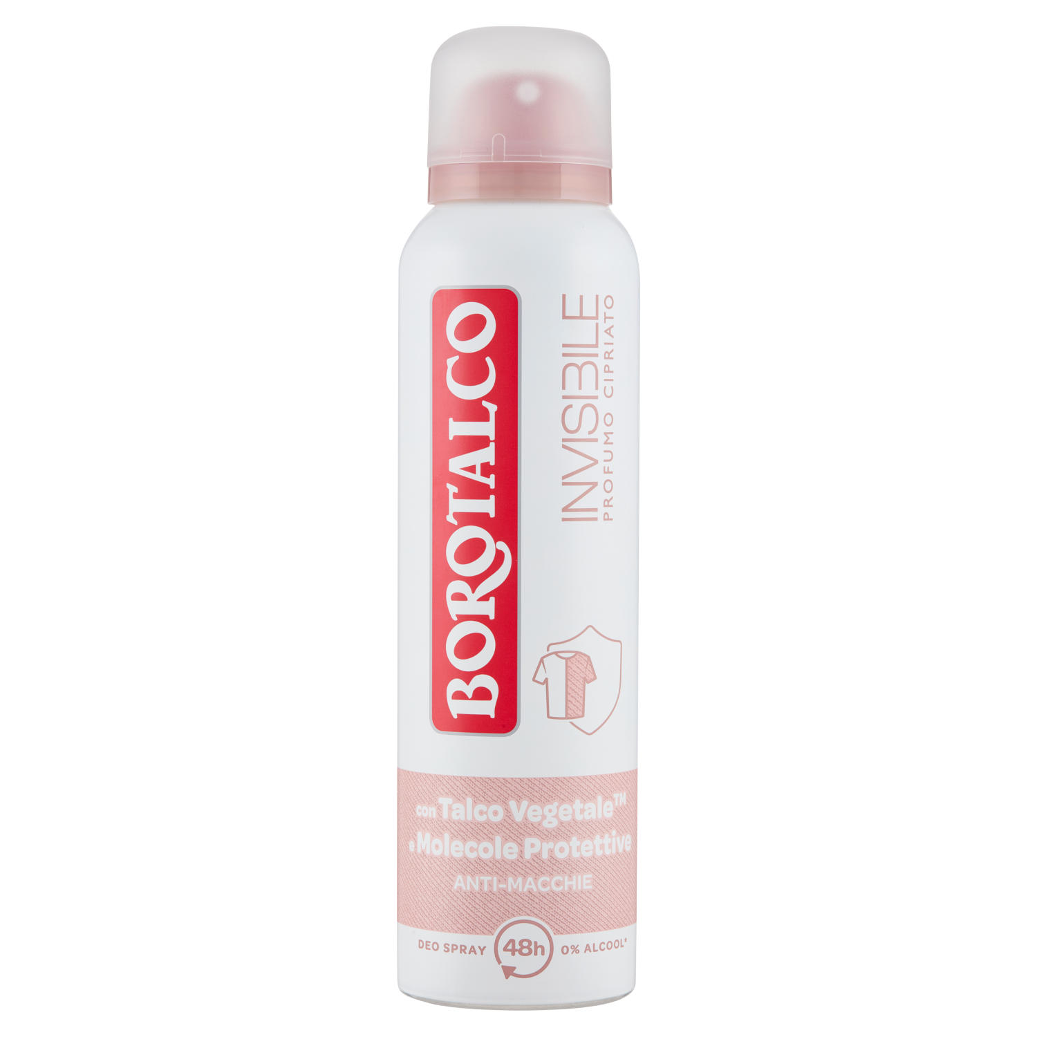 Abbraccia la nuova esperienza Borotalco con il deodorante Invisibile! La sua formula è arricchita con l'innovativo Talco Vegetale, un mix di polveri assorbenti d'origine vegetale, e Molecole Protettive: una rete di molecole invisibili che cattura e non trasferisce aloni, odori e macchie, per un effetto barriera tra pelle e vestiti e una sensazione asciutta. Efficace su macchie bianche e gialle, anche su capi delicati come la seta.