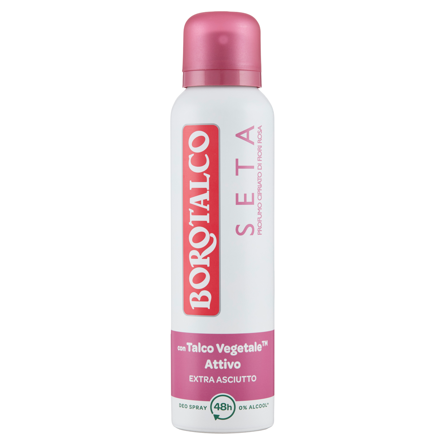 Abbraccia la nuova esperienza Borotalco con il deodorante Seta! La sua formula, arricchita con l'innovativo Talco Vegetale, un mix di polveri assorbenti d'origine vegetale, offre una tripla protezione: previene, assorbe e neutralizza le molecole di sudore.