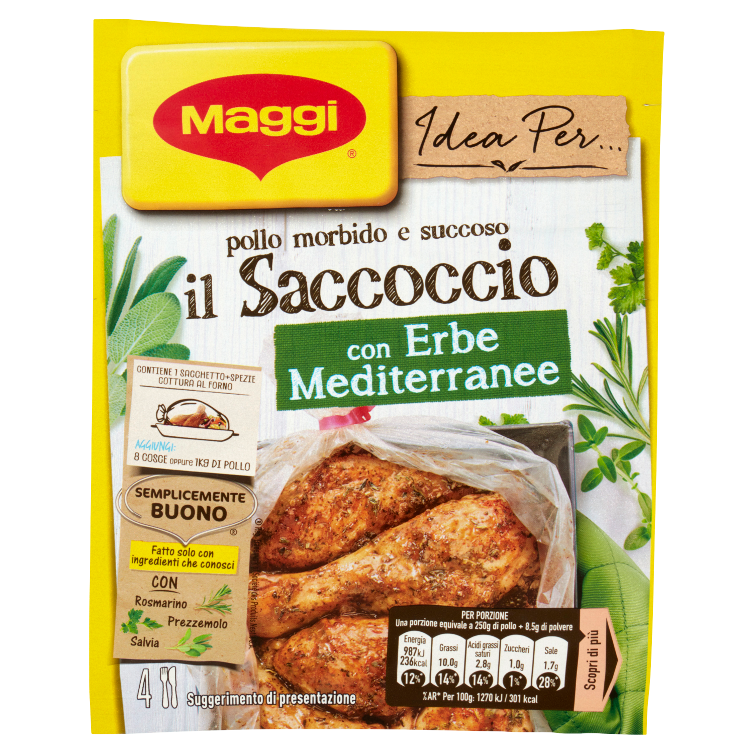 La porzione equivale a 250g di pollo + 8,5g di polvere |