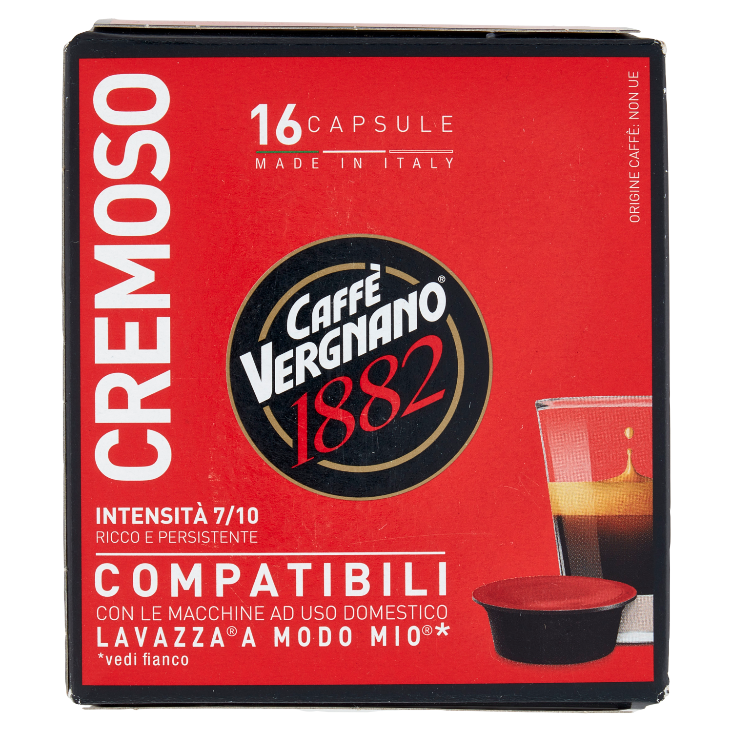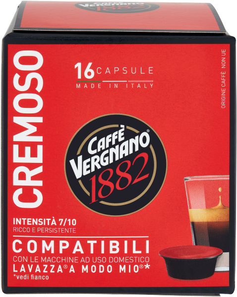 *Le capsule sono compatibili con le macchine ad uso domestico a marchio Lavazza a Modo Mio: Jolie, Piccina, Espressgo, Éspria, Favola Easy, Favola Plus, Favola Cappuccino, Magia, Minù, Simpla, Idola, Tiny, Fantasia, Desea, Jolie Milk. Lavazza, A Modo Mio, Lavazza A Modo Mio, Espressgo, Magia, Minù, Simpla: sono marchi registrati di titolarità della Luigi Lavazza S.p.A.. Casa del Caffè Vergnano S.p.A. è un produttore autonomo non collegato, nè direttamente, nè indirettamente alla Luigi Lavazza S.p.A.