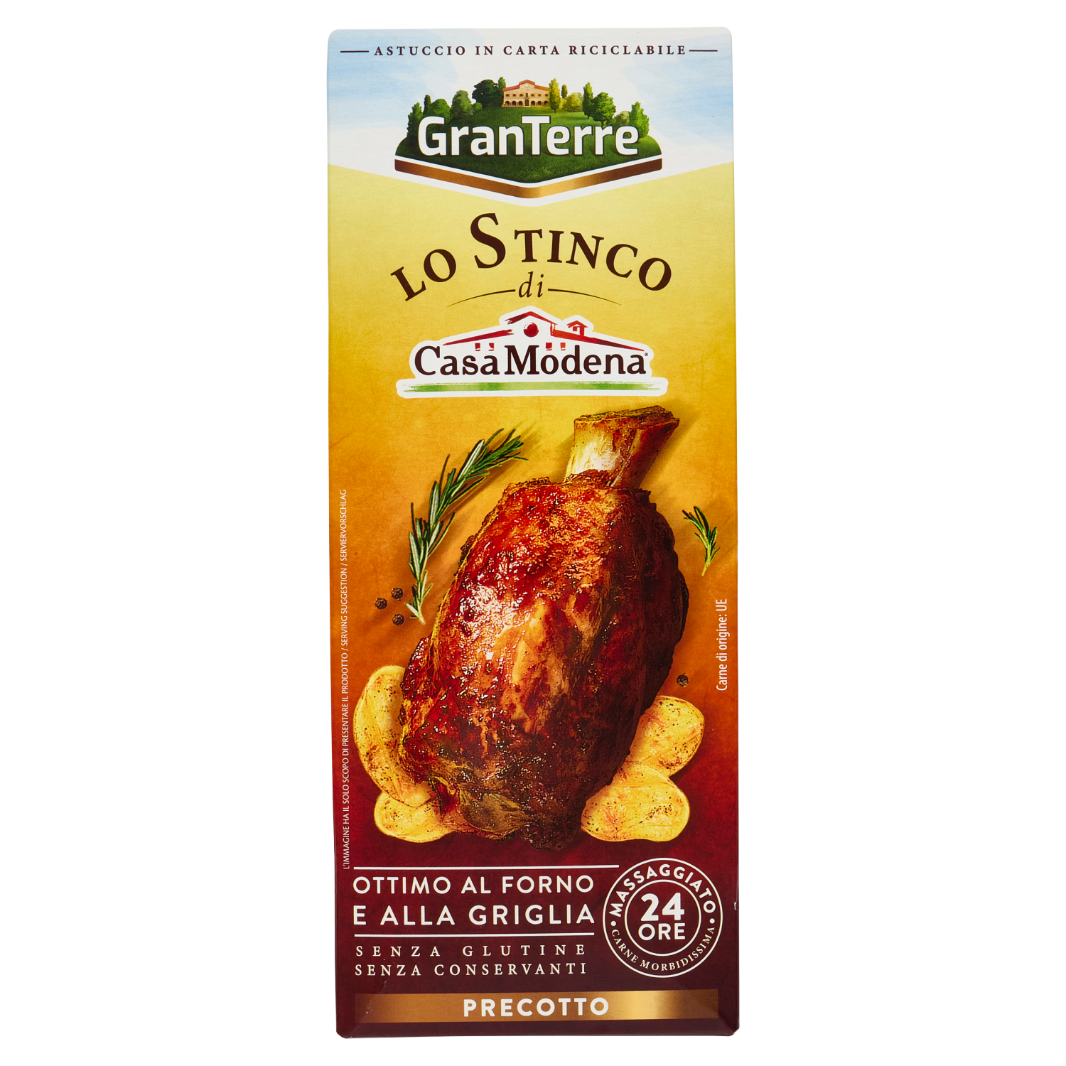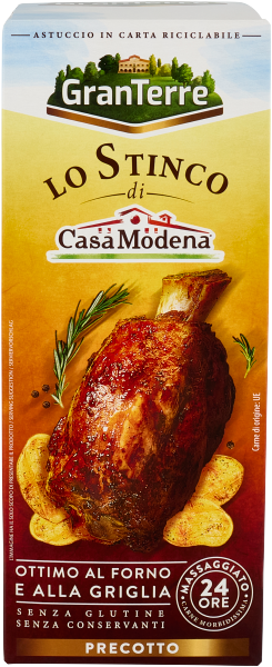 Ingredienti per 2 persone: 1 stinco precotto Casa Modena, 500g di patate, 1 spicchio d'aglio, olio extravergine, sale e pepe, qualche foglia di salvia, rosmarino, vino bianco.