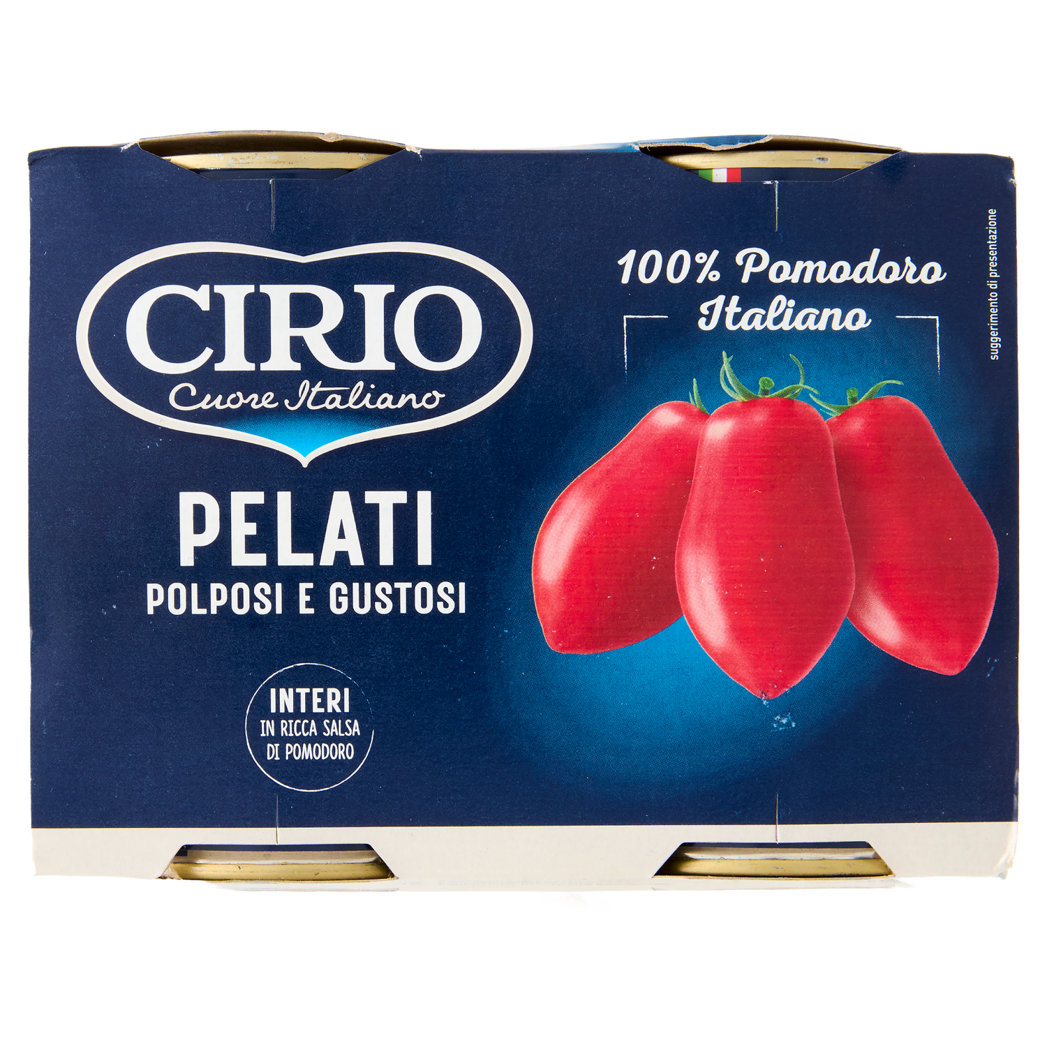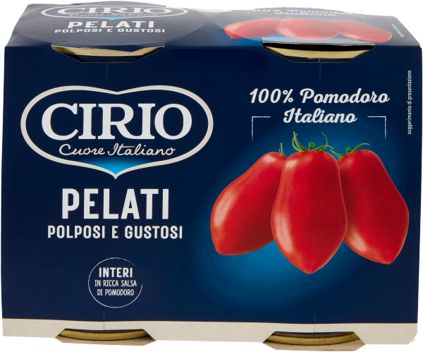 I Pelati Cirio, simbolo della cucina italiana, sono coltivati e lavorati con passione solo nelle zone di eccellenza. Pelati delicatamente a vapore mantengono tutta la polposità unica e il sapore inconfondibile del pomodoro fresco, esaltato dalla ricca salsa di pomodoro in cui sono immersi.