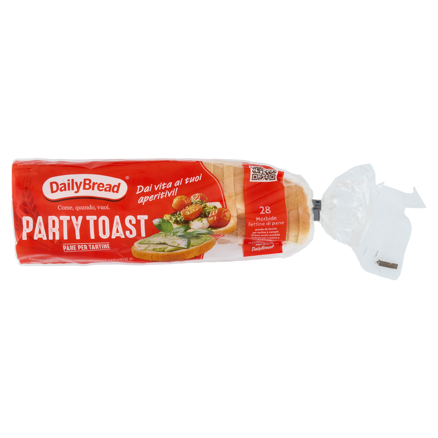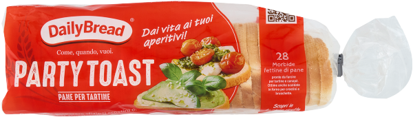 Tostate i Party Toast nel forno a 200°C per pochi minuti. Spalmate le fette con patè di olive. Guarnite con una fogliolina di basilico.
