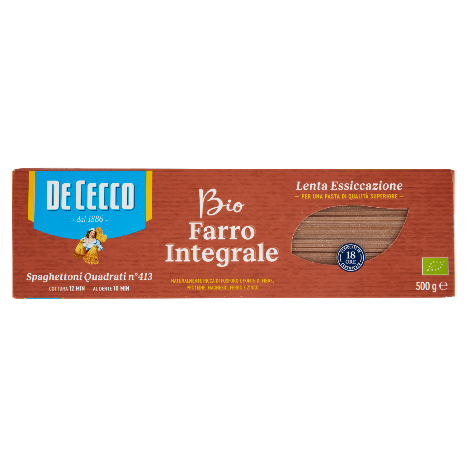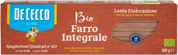 La Pasta di Farro Integrale Biologica De Cecco è naturalmente ricca di Fosforo e naturalmente fonte di Fibre, Proteine, Magnesio, Ferro e Zinco. Una dieta varia ed equilibrata ed uno stile di vita sano sono fondamentali per una buona salute.