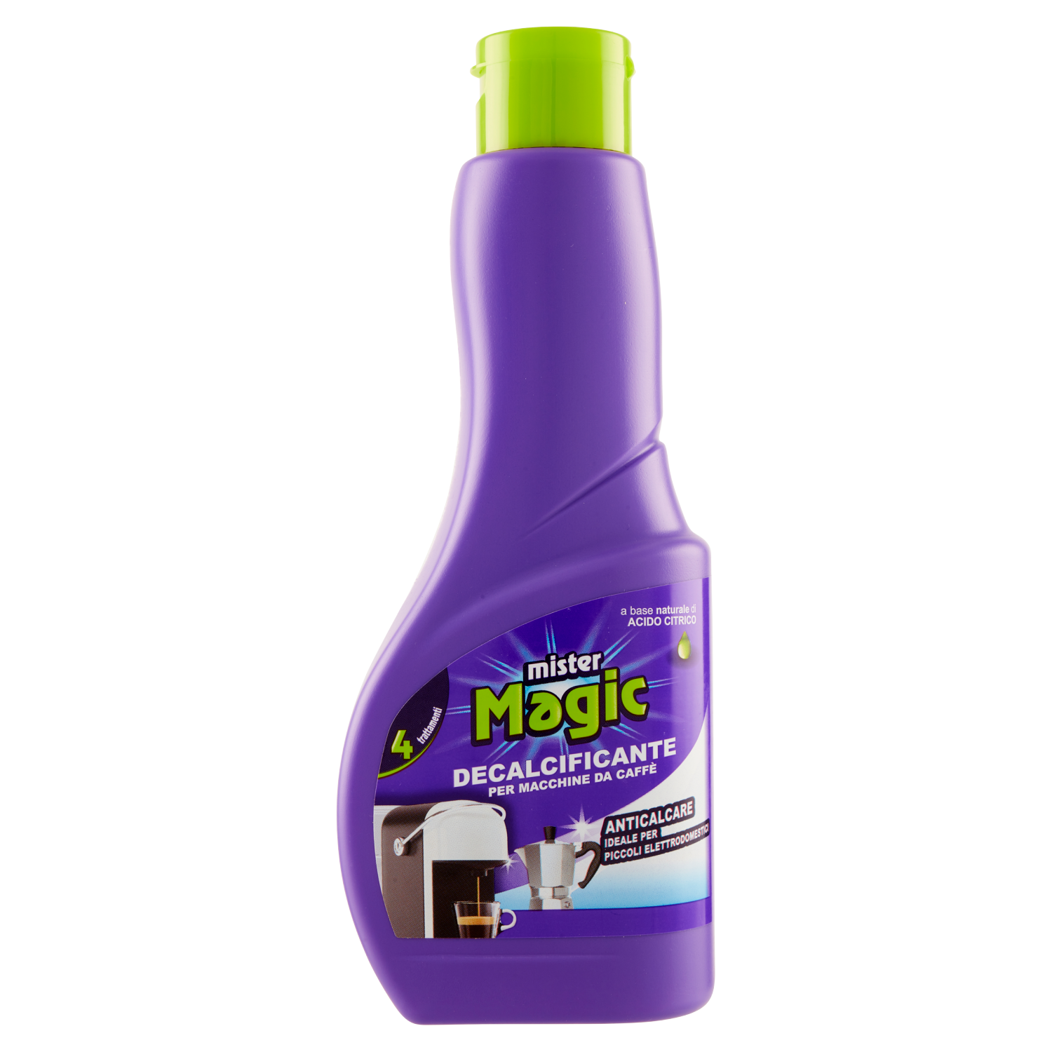 Mister Magic Decalcificante per Macchine da Caffè scioglie ed Elimina efficacemente i Depositi di Calcare e la ruggine. Il trattamento è naturale, a base di Acido Citrico. È utilizzabile come trattamento anticalcare per tutti i piccoli elettrodomestici, come bollitori per acqua tradizionali ed elettrici, umidificatori d'aria e ferri da stiro.