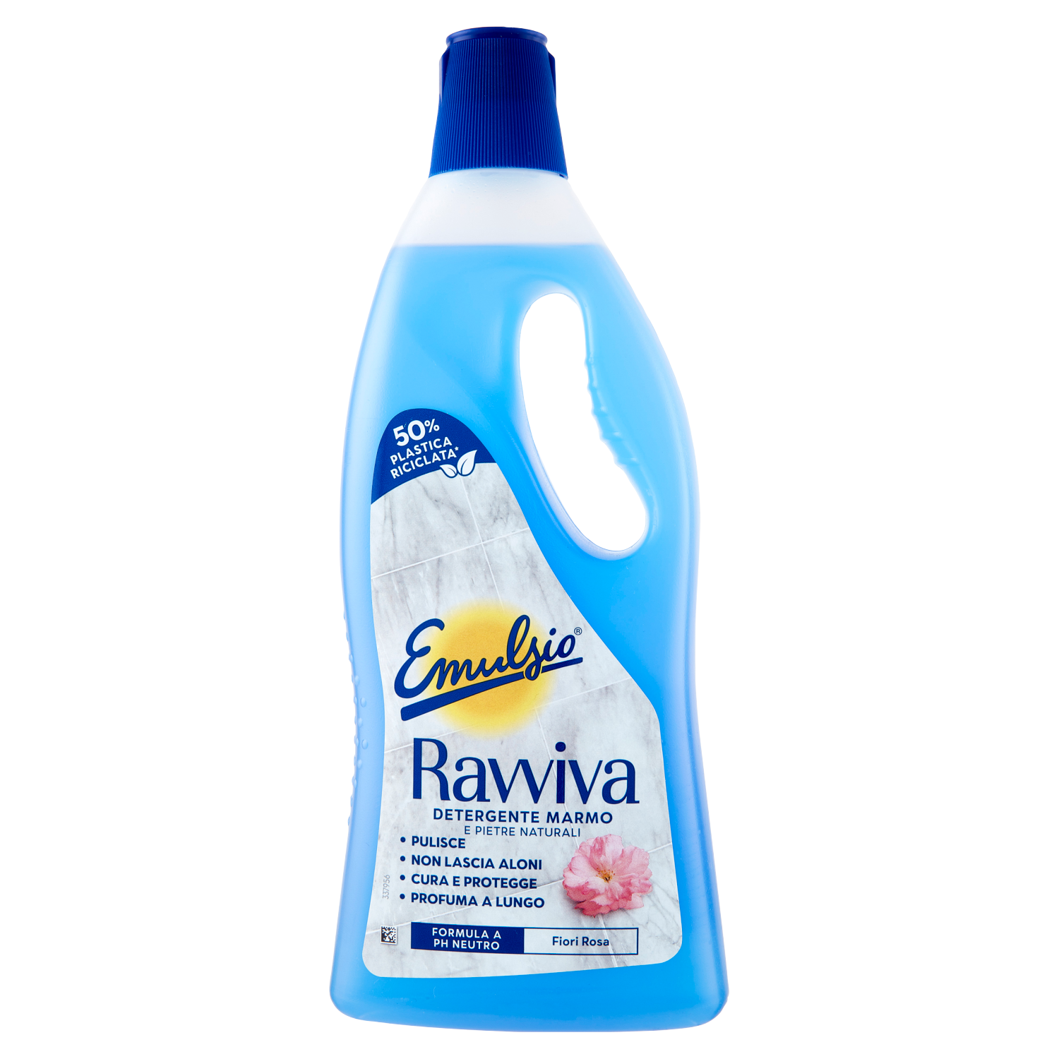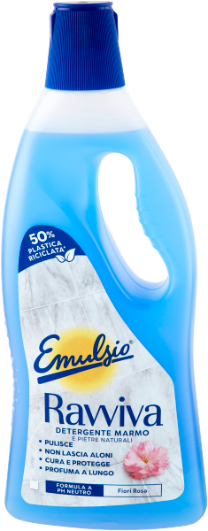 Emulsio, che da sempre si prende cura delle tue superfici pregiate, ha creato il nuovo Ravviva Detergente Marmo e pietre naturali. Grazie alla sua nuova formula a ph neutro pulisce senza lasciare aloni pavimenti e superfici in marmo, ceramica, granito, ardesia, resina, gres e tutte le pietre naturali. Inoltre, cura e protegge rilasciando un delicato profumo di Fiori Rosa che dura a lungo.