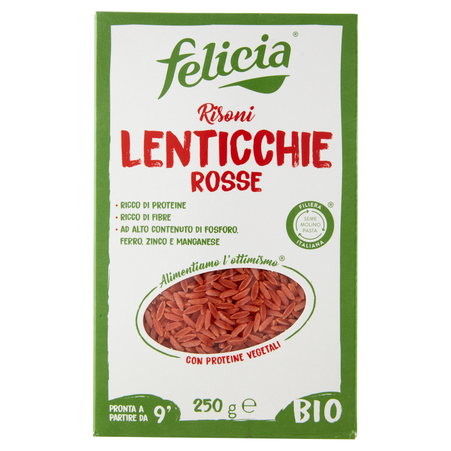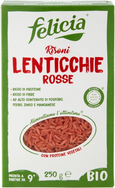 I Risoni di lenticchie rosse bio Felicia hanno il 26% di proteine*, sono ricchi di fibre e sali minerali come fosforo, ferro, zinco e manganese.
