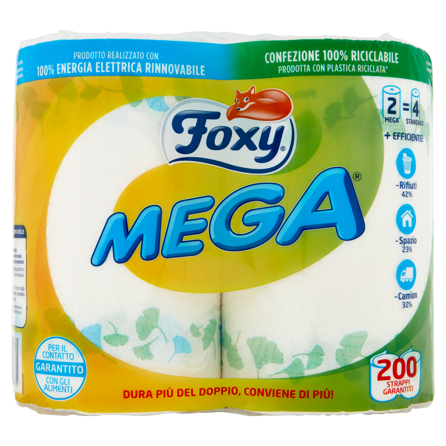 L'intero processo produttivo di Foxy Mega, dalla produzione della carta alla sua trasformazione, è realizzato con l'utilizzo del 100% di energia elettrica rinnovabileIndirizzo produttore