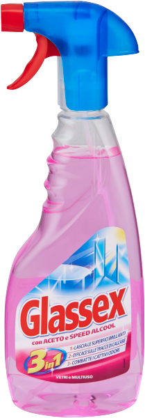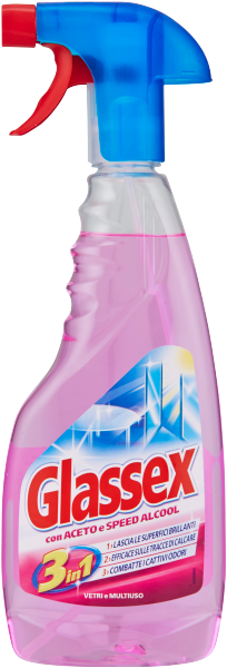 - Nuovo Glassex Vetri e Multiuso è ricaricabile. Finito il prodotto, basta conservare lo spruzzino, acquistare la ricarica e procedere come indicato: girare lo spruzzino di 45° in senso antiorario (Fig. 2). Attenzione: non ruotare più di 45°, non è un tappo da avvitare. Rimuovere lo spruzzino verso l'alto con decisione (Fig. 3). Posizionare lo spruzzino sopra la ricarica in una posizione antioraria di 45°. Spingere con decisione lo spruzzino verso il basso (Fig. 3). Girarlo di 45° in senso orario, allineandolo alla bottiglia (Fig. 2.).Avvertenze di sicurezza