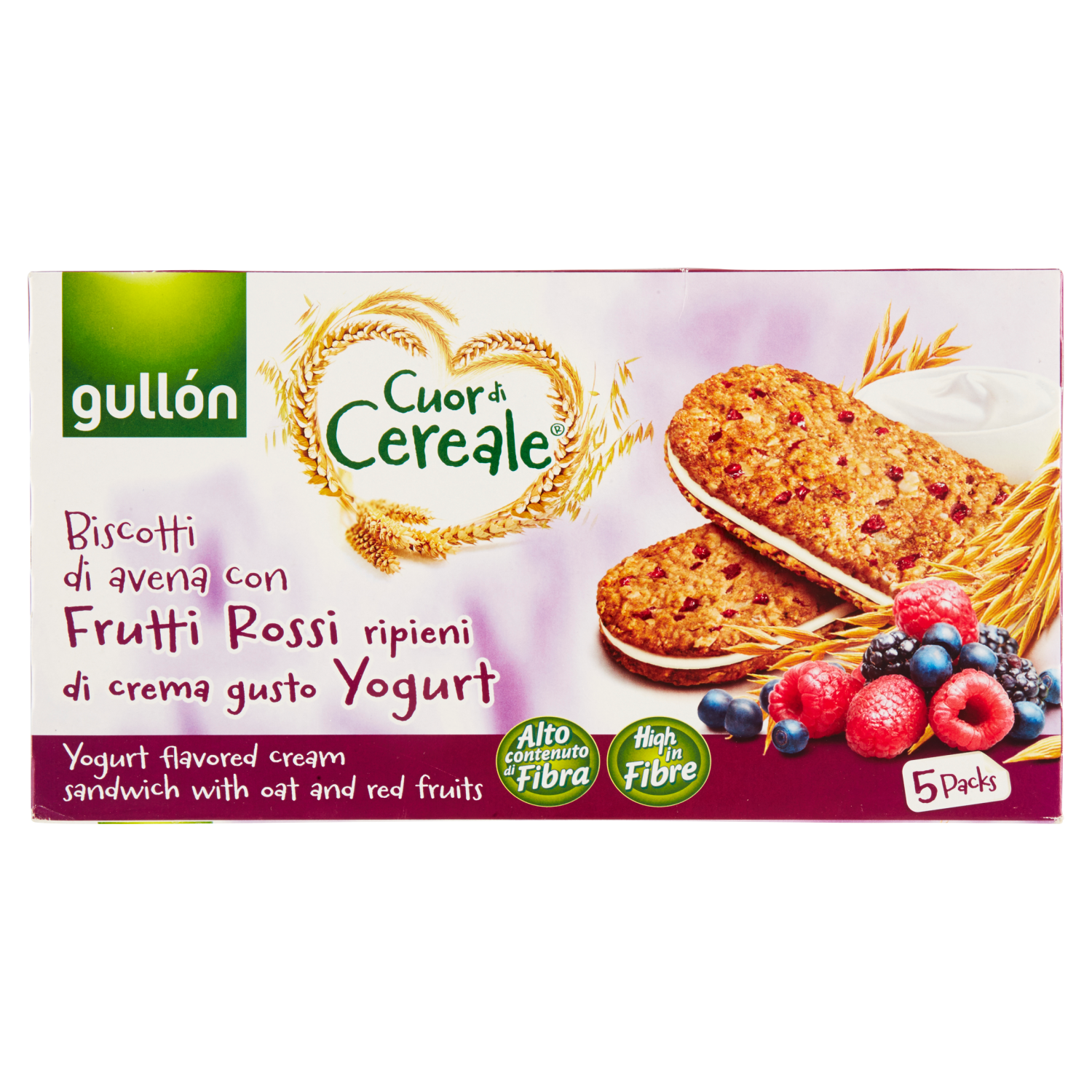 Preparato di frutti rossi 5% [frutti 49% (fragole, lampone e ribes nero), sciroppo di glucosio-fruttosio, sciroppo di glucosio, umidificante (glicerolo), zuccheri, fibre di frumento, agente gelificante (pectina), grasso vegetale (palma), correttori di acidità (acido malico e acido citrico), aromi]