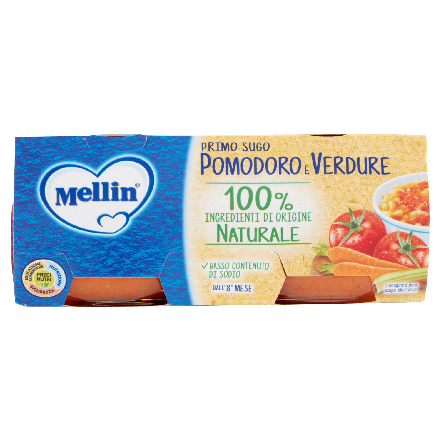 Alimento per la prima infanzia. Sugo pomodoro e verdure. Indicato a partire dall'8° mese compiuto, salvo diverso parere del PediatriaDichiarazione marketing relativa al prodotto specifico