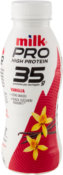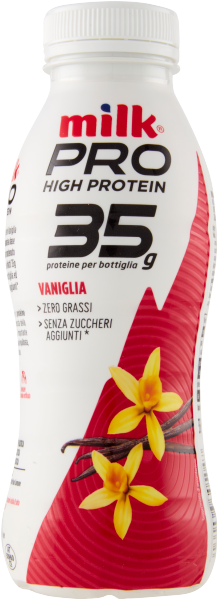 Milk Pro High Protein Vaniglia è una deliziosa bevanda a base latte, con un elevato contenuto proteico. Contiene infatti 35g di proteine per bottiglia ed è senza zuccheri aggiunti* e senza grassi!
