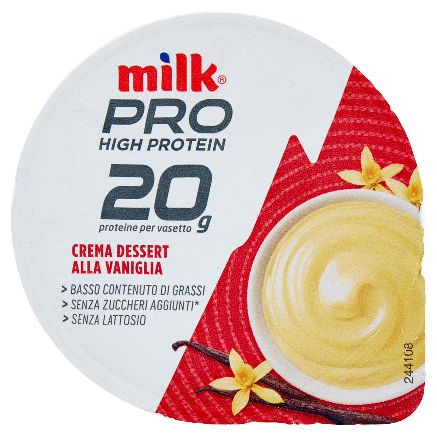 Milk Pro High Protein Crema Dessert alla vaniglia è un delizioso dessert delattosato (lattosio inferiore a 0,1g per 100g) con un elevato contenuto proteico. Contiene infatti 20g di proteine per vasetto ed è senza zuccheri aggiunti* ed a basso contenuto di grassi!