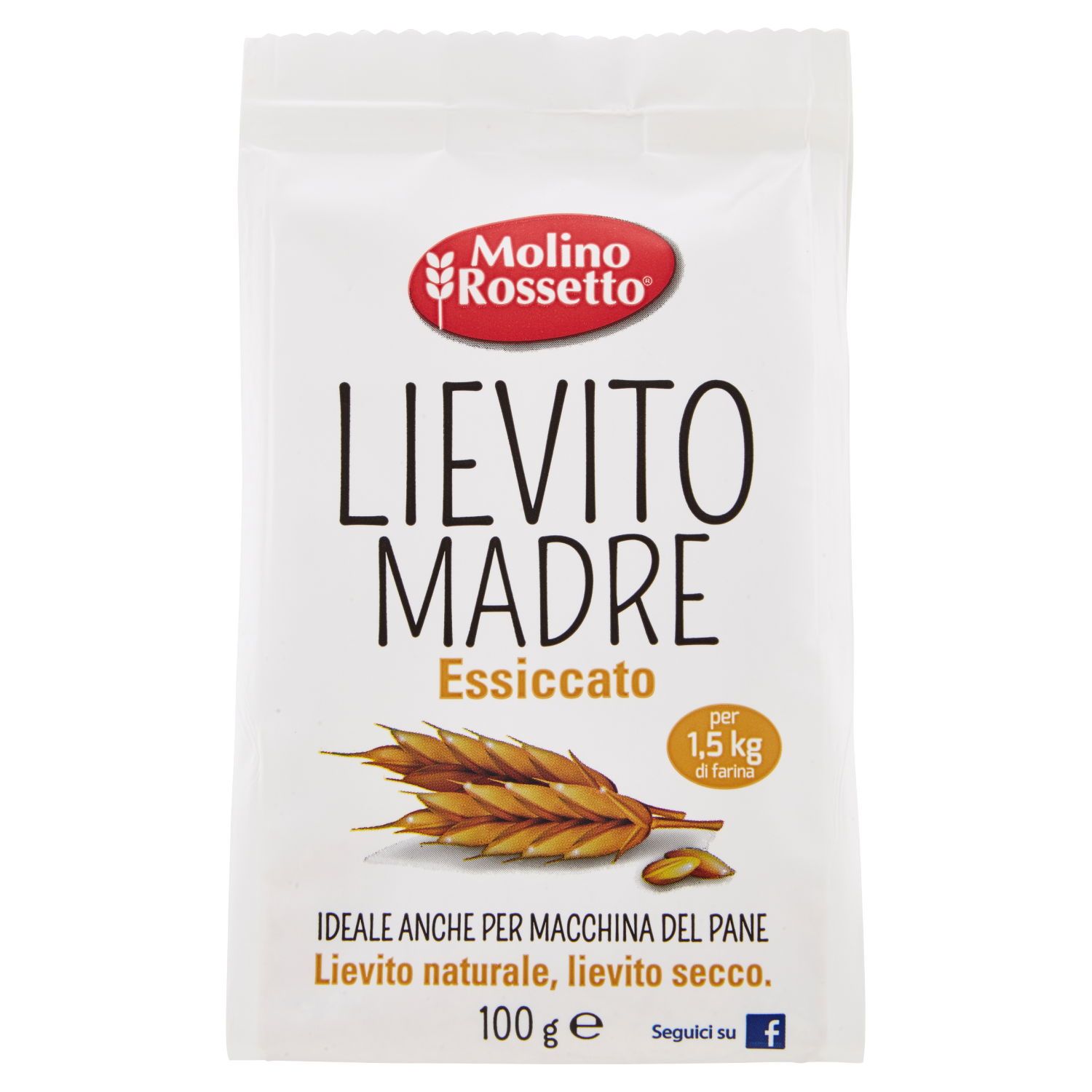 Ingredienti: 500 g di farina per pane, 35 g di lievito madre Molino Rossetto, 15 g di sale, 10 g di zucchero, 300 ml di acqua (temperatura ambiente).