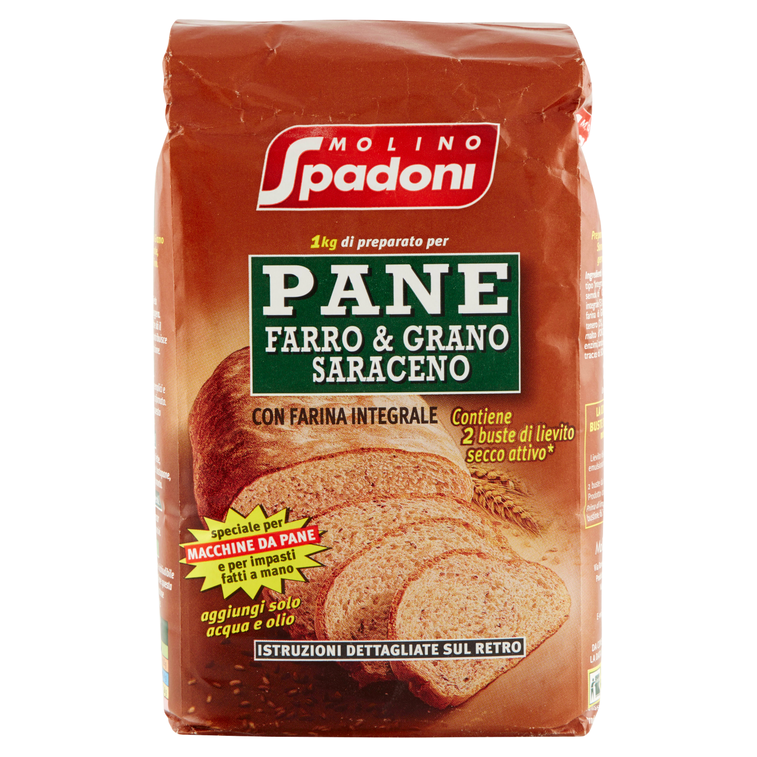 1 In una ciotola o nel robot versare 500 g di Miscela Pane Farro & Grano Saraceno, 1 bustina di lievito secco Spadoni che si trova all'interno del sacchetto in mezzo alla farina e 2 cucchiai di olio extra-vergine di oliva.