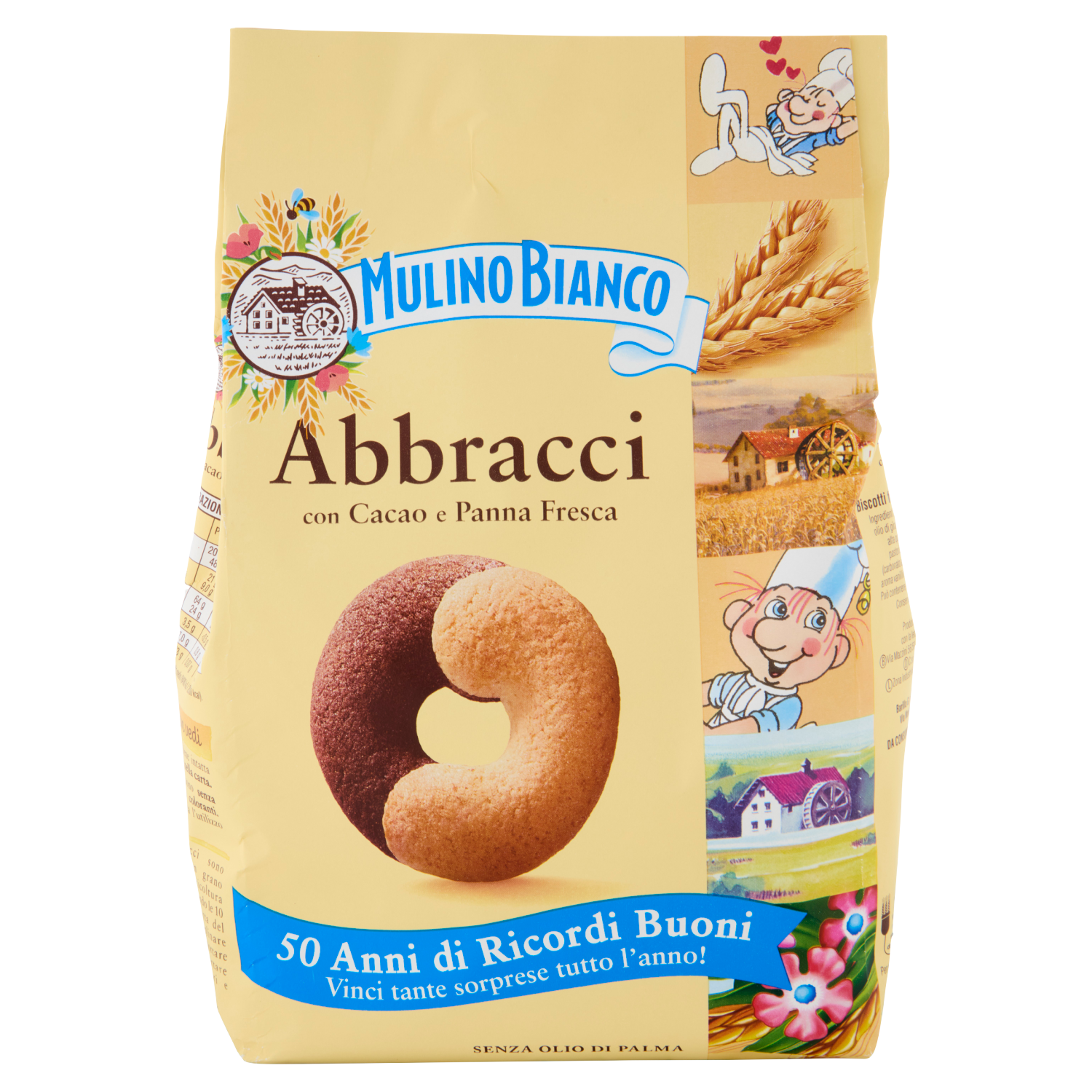 Gli Abbracci sono realizzati con grano tenero da agricoltura sostenibile, seguendo le 10 regole della Carta del Mulino, il disciplinare Mulino Bianco pensato per portare qualità nei prodotti, supportare il lavoro degli agricoltori e proteggere la biodiversità.