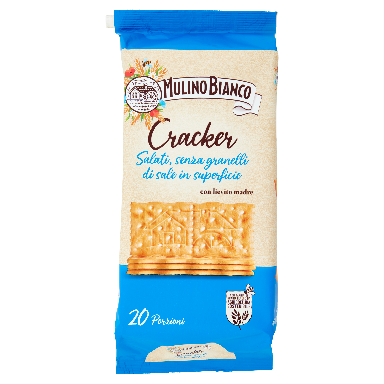 Ogni Cracker di questa confezione contiene farina di grano tenero ottenuta nel rispetto della Carta del Mulino, il disciplinare di coltivazione sostenibile redatto insieme al WWF che porta qualità nei prodotti, supporta il lavoro della comunità di agricoltori e protegge la biodiversità favorendo anche gli insetti impollinatori.