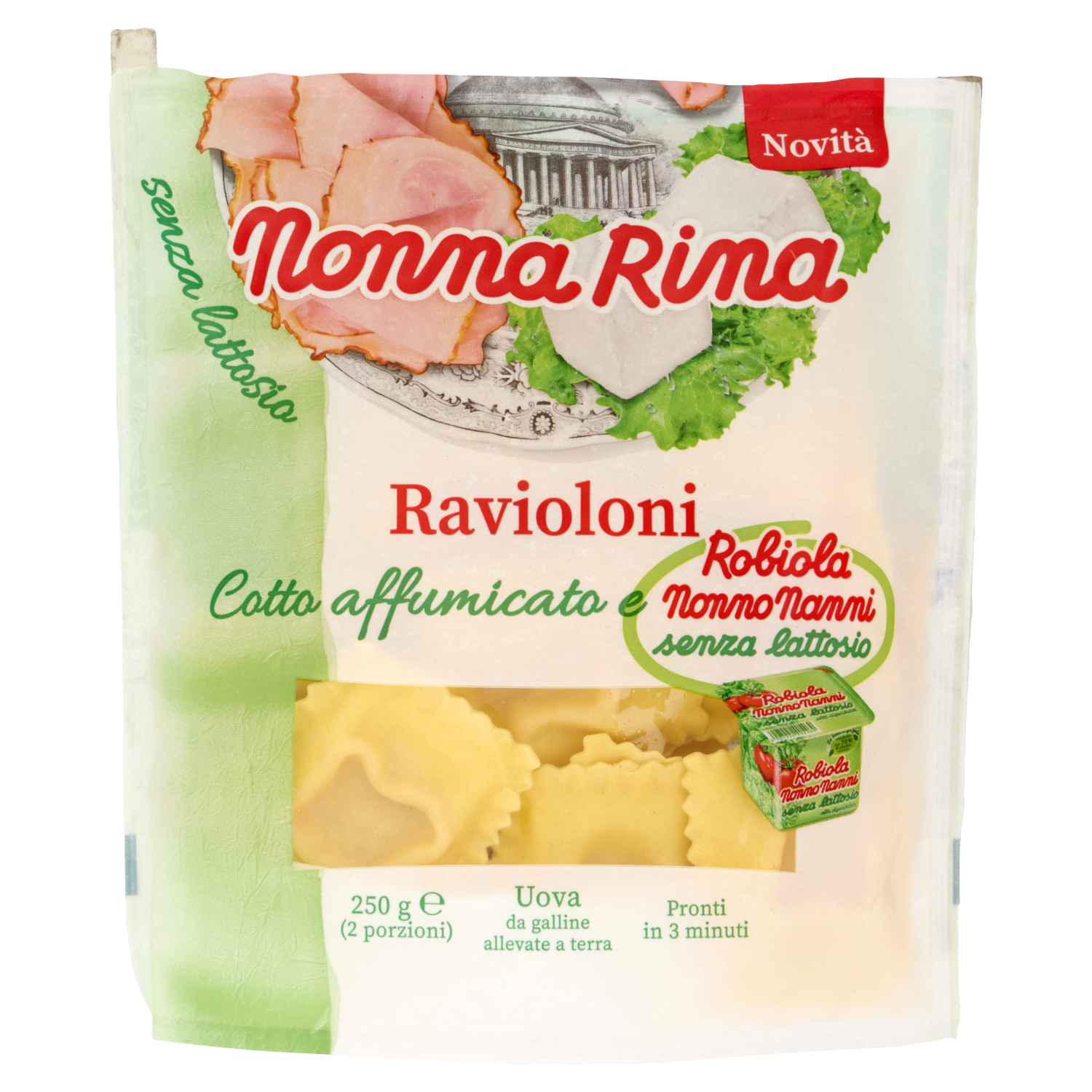 Ingredienti del ripieno 60%: ricotta senza lattosio* 34 % (siero di latte, sale), prosciutto cotto affumicato 25 % (carne di suino, sale, destrosio, aromi naturali, aromi di affumicatura, antiossidante: E301, conservante: E250), robiola senza lattosio* 12 % (latte, crema di latte, sale, conservante: E 202), mozzarella senza lattosio* 12 % (latte delattosato, sale), formaggio duro naturalmente privo di lattosio** 11 % (latte, sale), fiocco di patate, amido, fibra di patata, fibra di frumento, sale, pepe, aroma umami