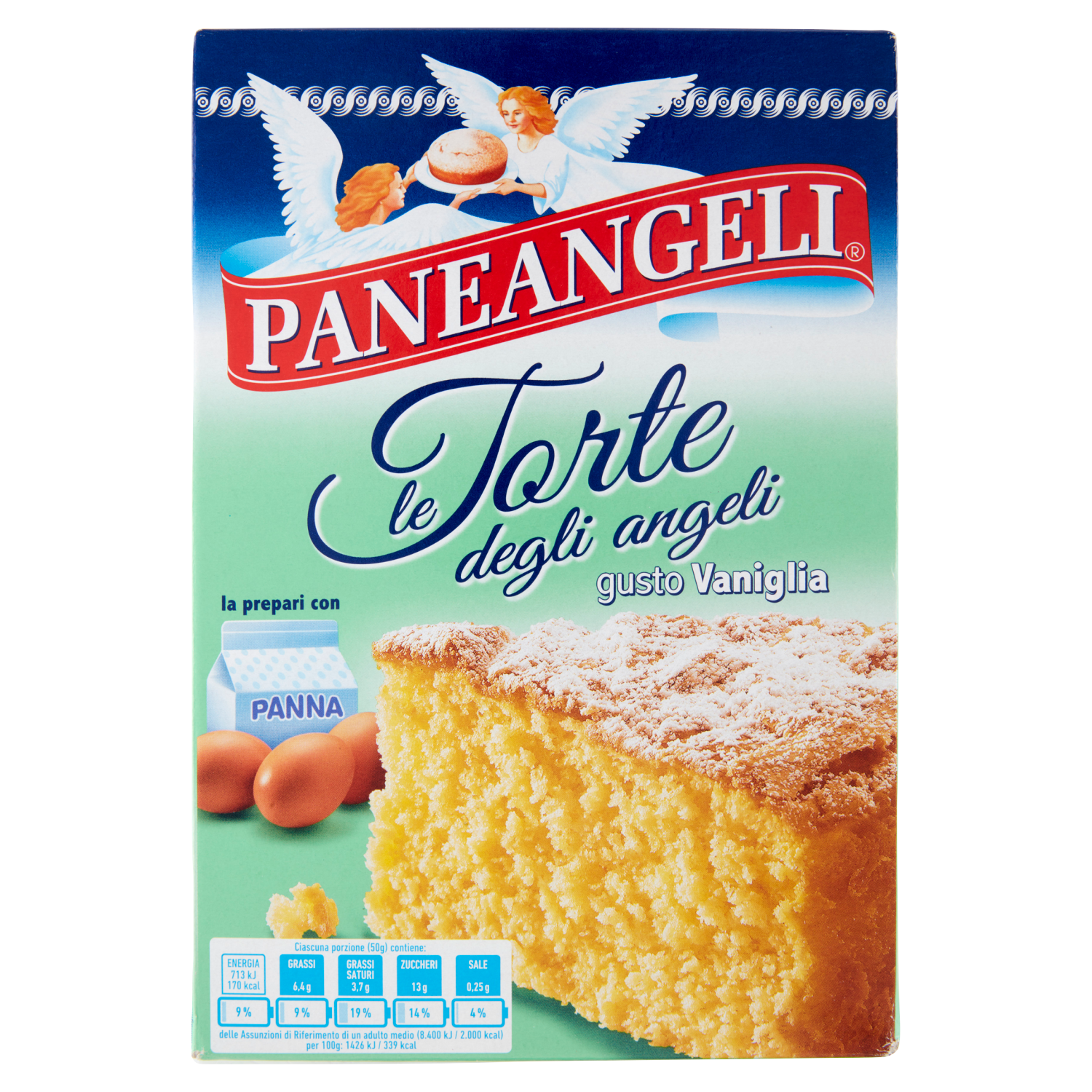 Miscela per l'impasto 400 g: zucchero, farina di GRANO tenero, amido di FRUMENTO, sciroppo di glucosio, agenti lievitanti (gluconodeltalattone, carbonato acido di sodio, fosfato monocalcico), emulsionanti (esteri lattici di mono- e digliceridi degli acidi grassi, esteri acetici di mono- e digliceridi degli acidi grassi), LATTE scremato in polvere, addensante (gomma di xanthan), aroma