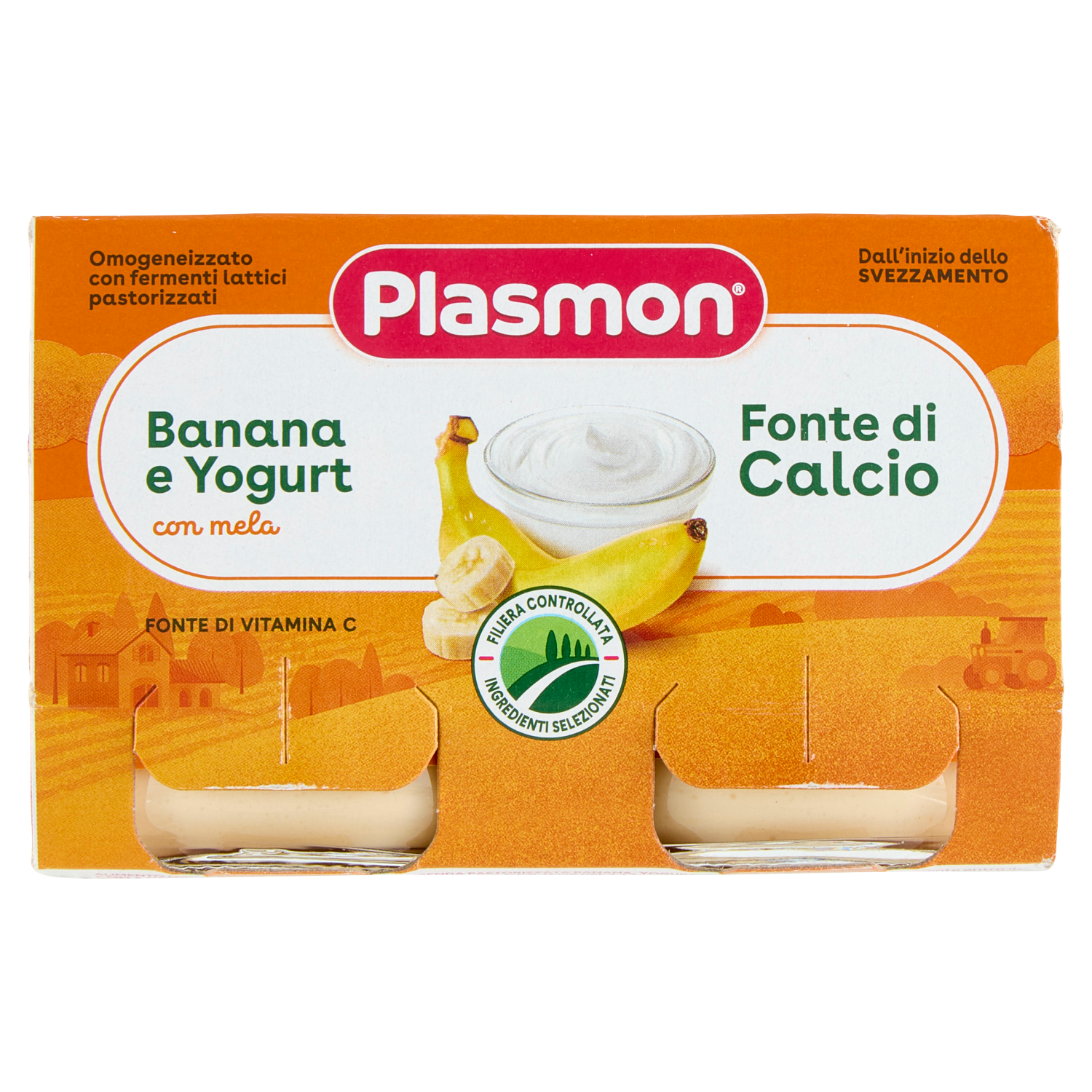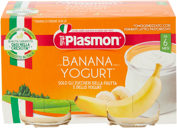 Alimento per l'infanzia omogeneizzato merenda pastorizzata banana, yogurt e mela con fermenti lattici pastorizzati. A norma del D.P.R. n.128 del 7.4.99
