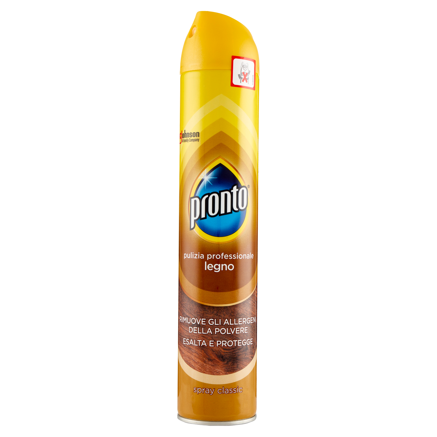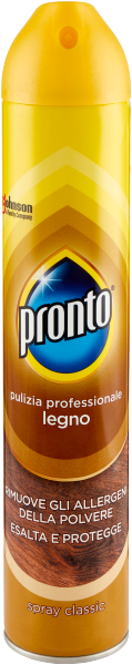 Pronto Spray Legno Classic migliora l'aspetto delle superfici in legno sigillato rimuovendo facilmente la polvere e le impronte e fornendo uno strato protettivo e lucido senza lasciare residui cerosi.