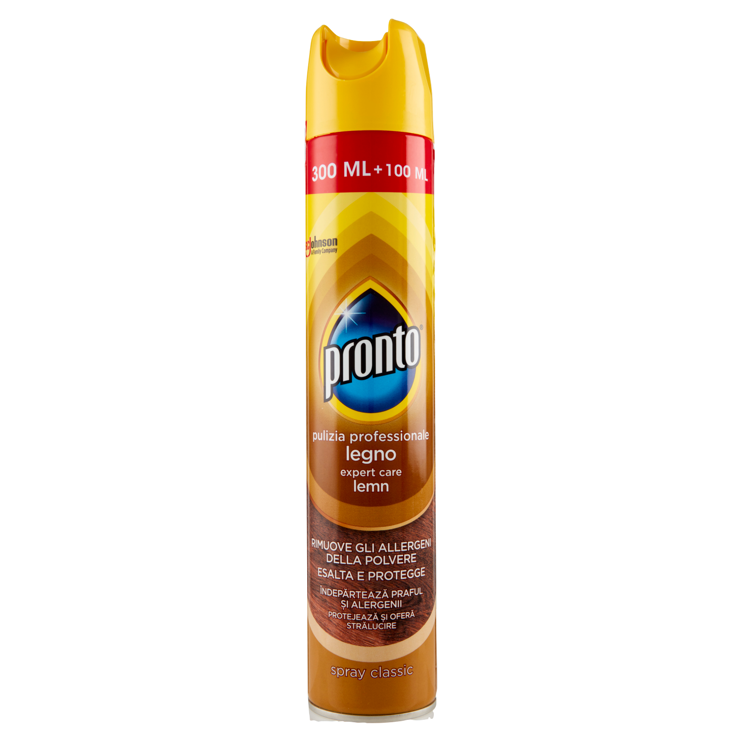 Pronto Spray Legno Classic migliora l'aspetto delle superfici in legno rimuovendo facilmente la polvere e le impronte e fornendo uno strato protettivo e lucido senza lasciare residui cerosi.