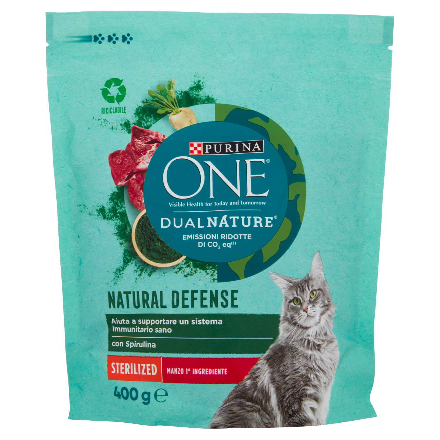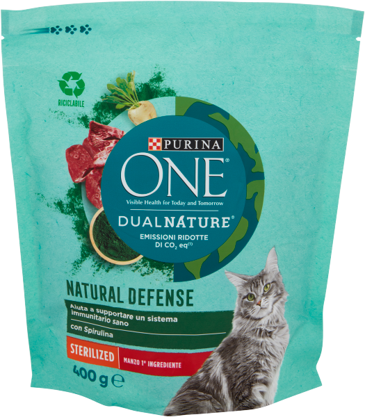 Siamo orgogliosi di poter dire che PURINA ONE DUALNATURE ha ridotto le emissioni di CO₂ eq dei suoi prodotti rispetto al 2019, ottimizzando le ricette, i metodi di produzione, le confezioni e il sistema di distribuzione. Non ci fermiamo qui e continueremo a lavorare per ridurle