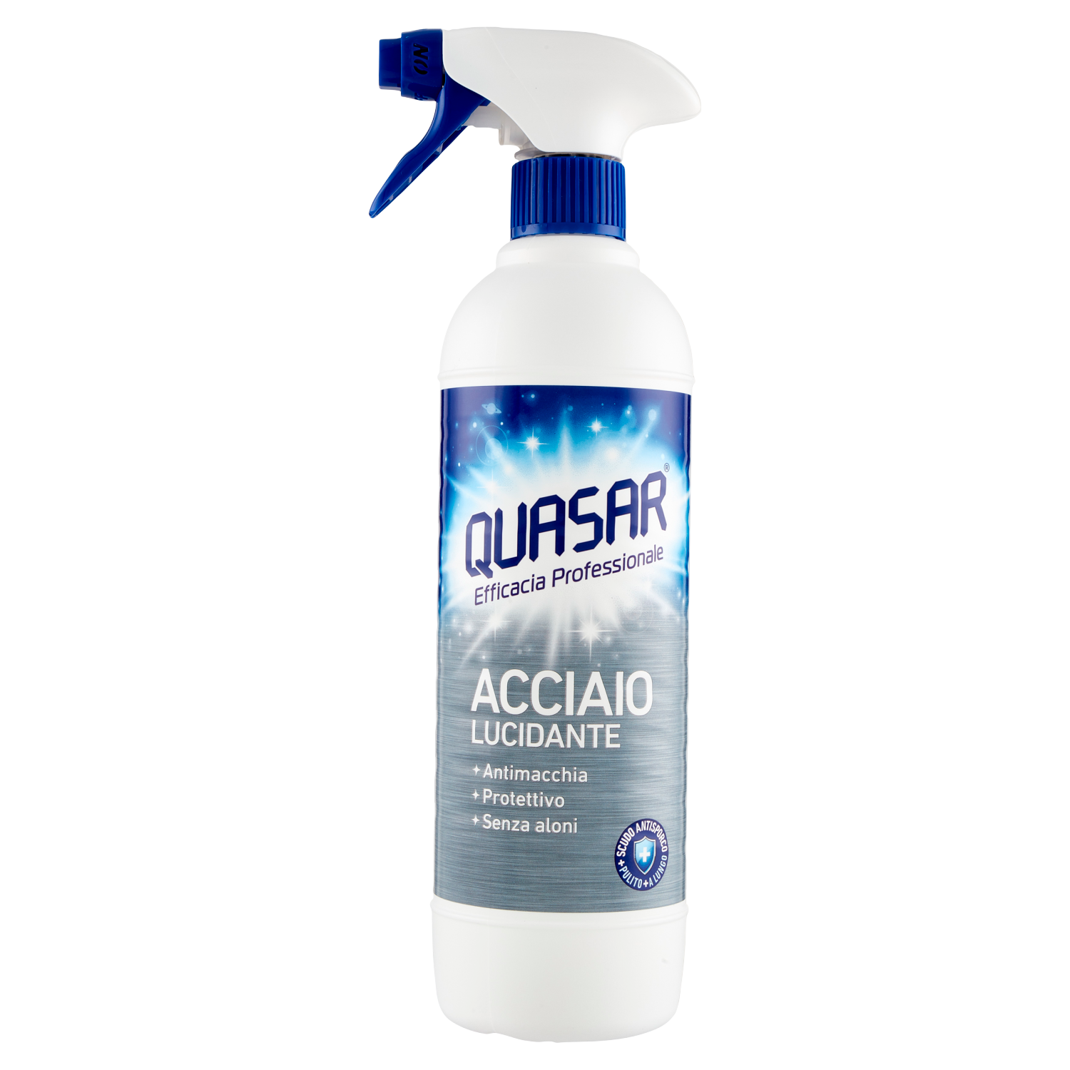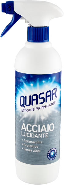 Quasar Acciaio rimuove efficacemente lo sporco facendo brillare le superfici in acciaio senza lasciare tracce e aloni. Asciuga rapidamente, creando una protezione che aiuta a prevenire le macchie d'acqua e le impronte. Ne basta poco per un pulito veloce e profondo.