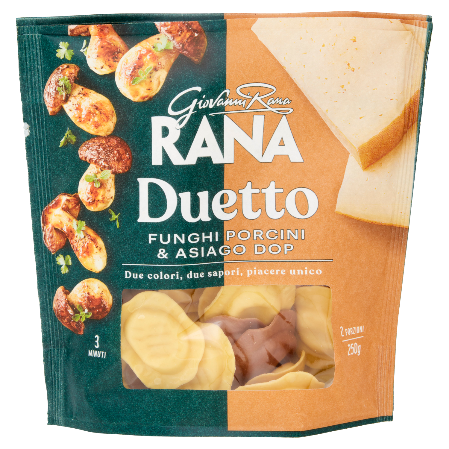 Pasta fresca all'uovo con ripieno al formaggio Asiago D.O.P. - Ingredienti: Ripieno 52%: formaggio Asiago DOP* 40%, ricotta (siero di latte, latte, sale), crema di latte, siero di latte in polvere, fibre vegetali, pangrattato (farina di grano tenero, acqua, sale, lievito), olio di girasole, amidi, burro, sale, aromi naturali. Pasta 48%: farina di grano tenero, uovo 30%, semola di grano duro