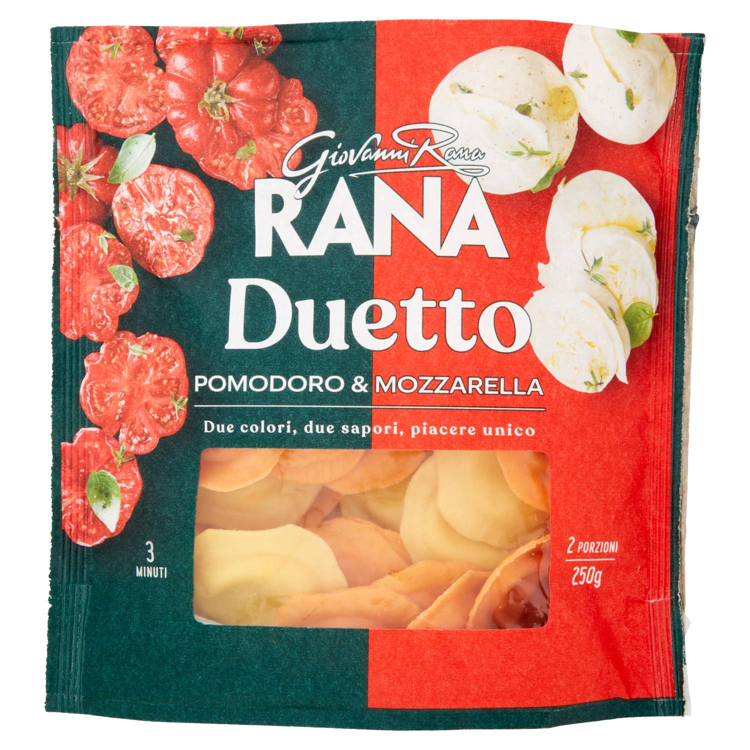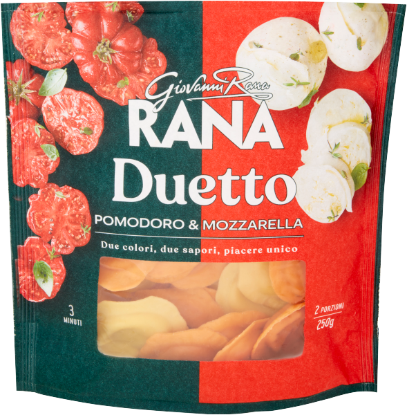 Pasta fresca all'uovo e pomodoro con ripieno al pomodoro - Ingredienti: ripieno 52%: concentrato di pomodoro 16%, passata di pomodoro 15%, formaggio mozzarella 15%, ricotta (siero di latte, latte, sale), fibre vegetali (cicoria e frumento), formaggio grattugiato, siero di latte in polvere, formaggio mascarpone, pangrattato (farina di grano tenero, acqua, sale, lievito), olio di girasole, olio extra vergine di oliva, sale, aglio, origano 0,1%, basilico 0,1%, aromi naturali. Pasta 48%: farina di grano tenero, uovo 30%, semola di grano duro, pomodoro in polvere 3%