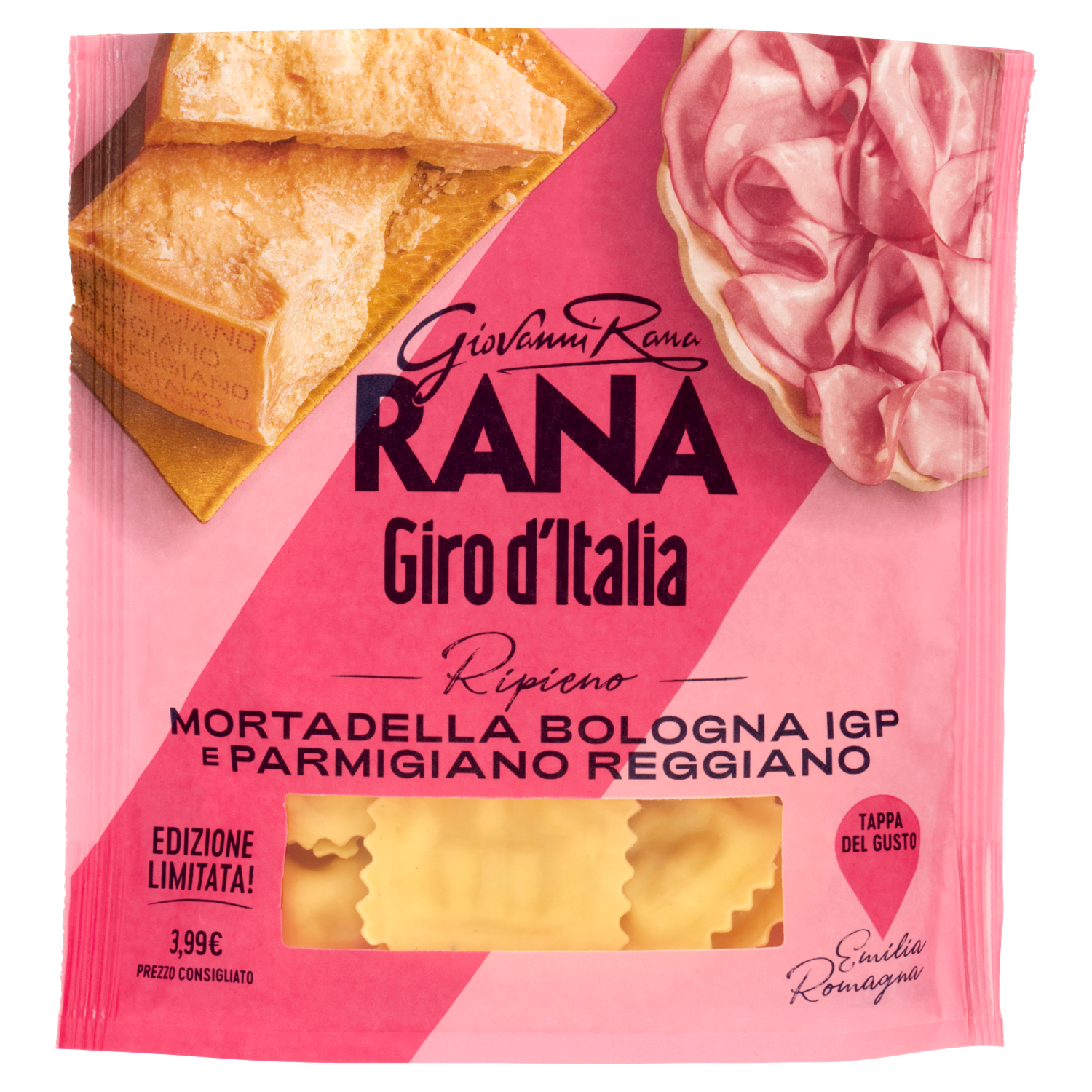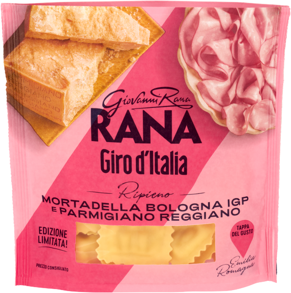 Ripieno 58%: ricotta (siero di latte, latte, sale), Mortadella Bologna IGP* 17% (carne di suino, trippino suino, sale, aromi naturali, pepe, spezie), formaggio Parmigiano Reggiano DOP** 9%, crema di latte, panna acida (contiene latte), olio di girasole, formaggio mascarpone, siero di latte in polvere, pangrattato (farina di grano tenero, acqua, sale, lievito), fibre vegetali (di mais e frumento), sale, aromi naturali, aglio, pepe nero Tellicherry