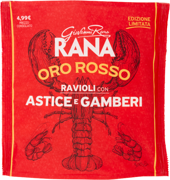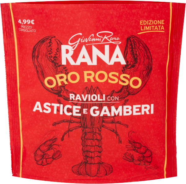 Ripieno 59%: polpa di astice 20%, gamberi 20%, siero di latte in polvere, ricotta (siero di latte, latte, sale), fibre vegetali (di mais e patata), burro, olio di girasole, crema di latte, pangrattato (farina di grano tenero, acqua, sale, lievito), formaggio mascarpone, panna acida (contiene latte), bisque di pesce (acqua, carote, olio di girasole, concentrato di pomodoro, pomodoro, sale, burro, cozze, succo di carota, scampi, porro, scalogno, merluzzo, olio extra vergine di oliva, amido di mais, estratto di pepe nero), concentrato di pomodoro, sale, prezzemolo, amidi, aromi naturali (contengono crostacei, pesce, molluschi), aglio, erba cipollina
