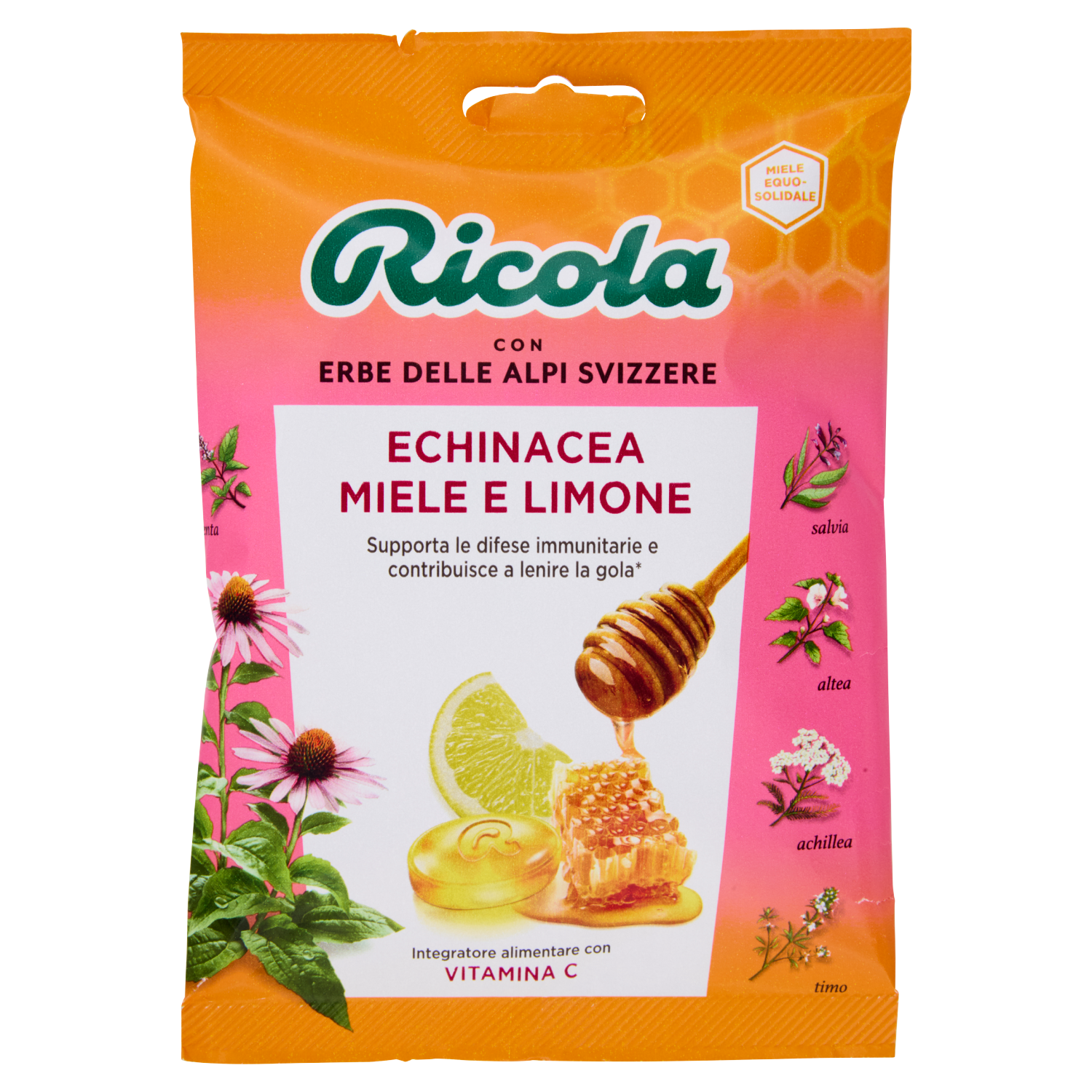 *La vitamina C contribuisce al normale funzionamento del sistema immunitario. Il mentolo contribuisce a lenire la gola. Contiene la tradizionale miscela di 13 erbe Ricola, miele, limone ed echinacea