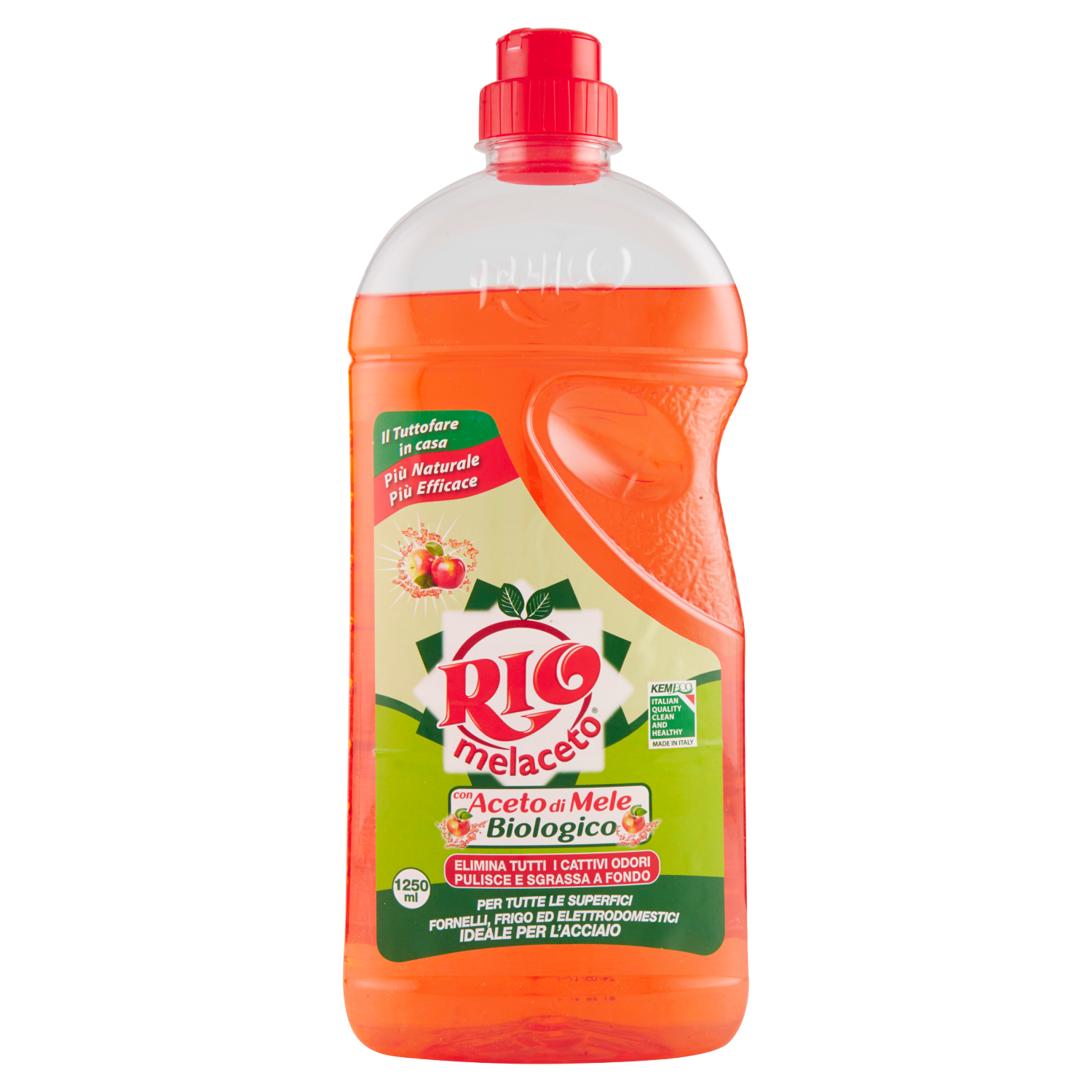 Rio Melaceto con Aceto di Mele Biologico (certificato I.C.E.A.). Pulisce e sgrassa tutte le superfici lavabili, mobili ed elettrodomestici. Elimina tutti i cattivi odori (pesce, uova, ecc.) con effetto deodorante, lascia a lungo un fresco profumo. Ideale per acciaio, legno, teak, plexiglass, laminati plastici e tutti i metalli, formica, ceramica, maioliche e tutte le superfici lucide. Ideale in cucina, sgrassa e deodora piastrelle, lavelli, pensili, forni, cappe, fornelli, frigo e tutti gli elettrodomestici.