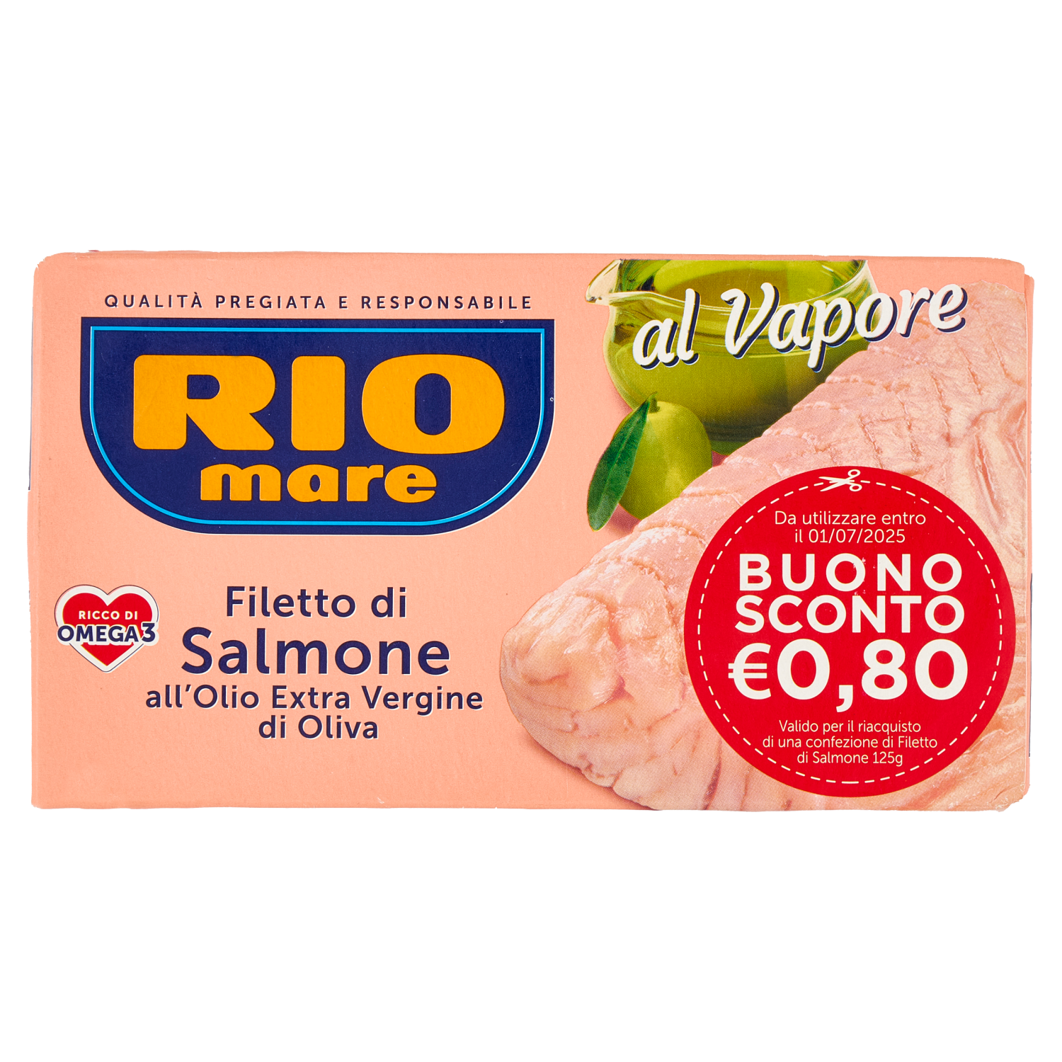 Prova il gusto delicato del Filetto di Salmone Rio Mare all'Olio Extra Vergine di Oliva: un filetto di Salmone di prima qualità (Salmo Salar), integro, tenero e senza lische, cotto al vapore e condito con il nostro miglior olio extra vergine di oliva. Gustoso e nutriente, il Filetto di Salmone Rio Mare è fonte di proteine nobili e ricco di omega 3 (EPA+DHA), acidi grassi essenziali che con 250 mg al giorno contribuiscono alla normale funzione cardiaca in un'alimentazione varia ed equilibrata.