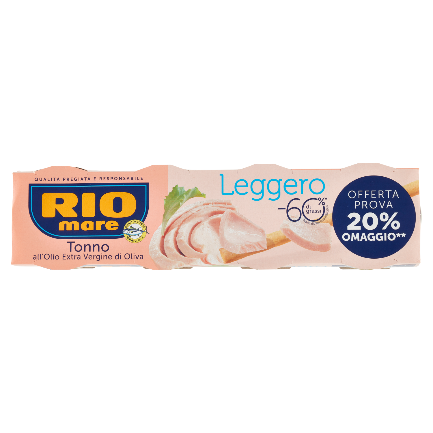 Rio Mare Leggero è l'unico tonno con tutto il gusto Rio Mare e il 60% di grassi in meno*. Solo tonno di qualità pinne gialle e una goccia di olio extra vergine di oliva: l'ideale per stare in forma e leggero senza rinunciare al gusto. E non si sgocciola! Rio Mare Leggero è fonte di omega 3 (EPA+DHA), acidi grassi essenziali, che, con 250mg al giorno, contribuiscono alla normale funzione cardiaca e cerebrale, in un'alimentazione varia ed equilibrata.