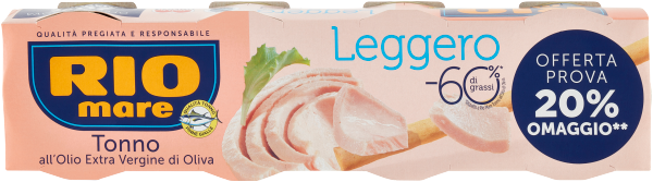 *Rio Mare Leggero contiene il 60% di grassi in meno rispetto a Rio Mare Tonno all'Olio di Oliva (contenuto in grassi di Rio Mare Tonno all'Olio di Oliva: 20g per 100g di prodotto sgocciolato).