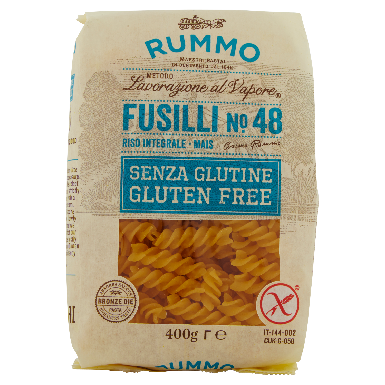 Ho voluto creare una pasta senza glutine, senza però togliere il piacere e la consistenza della pasta classica. Selezioniamo riso integrale, mais giallo e mais bianco crudo rigorosamente privi di OGM, poi li amalgamiamo con un elemento naturale ed antichissimo: il vapore. È proprio grazie al nostro Metodo di Lavorazione al Vapore che otteniamo un impasto morbido e bilanciato, che poi trafiliamo al bronzo ottenendo una sfoglia ruvida paesana che trattiene perfettamente il condimento. Il risultato è questa Rummo senza glutine, con una consistenza impareggiabile.