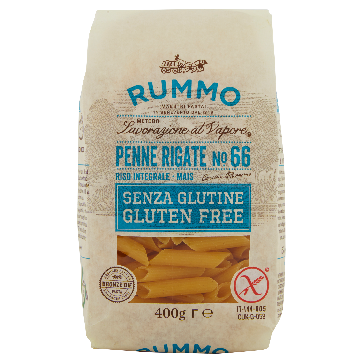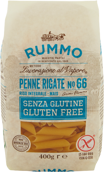Ho voluto creare una pasta senza glutine, senza però togliere il piacere e la consistenza della pasta classica. Selezioniamo riso integrale, mais giallo e mais bianco crudo rigorosamente privi di OGM, poi li amalgamiamo con un elemento naturale ed antichissimo: il vapore. È proprio grazie al nostro Metodo di Lavorazione al Vapore che otteniamo un impasto morbido e bilanciato, che poi trafiliamo al bronzo ottenendo una sfoglia ruvida paesana che trattiene perfettamente il condimento. Il risultato è questa Rummo senza glutine, con una consistenza impareggiabile.