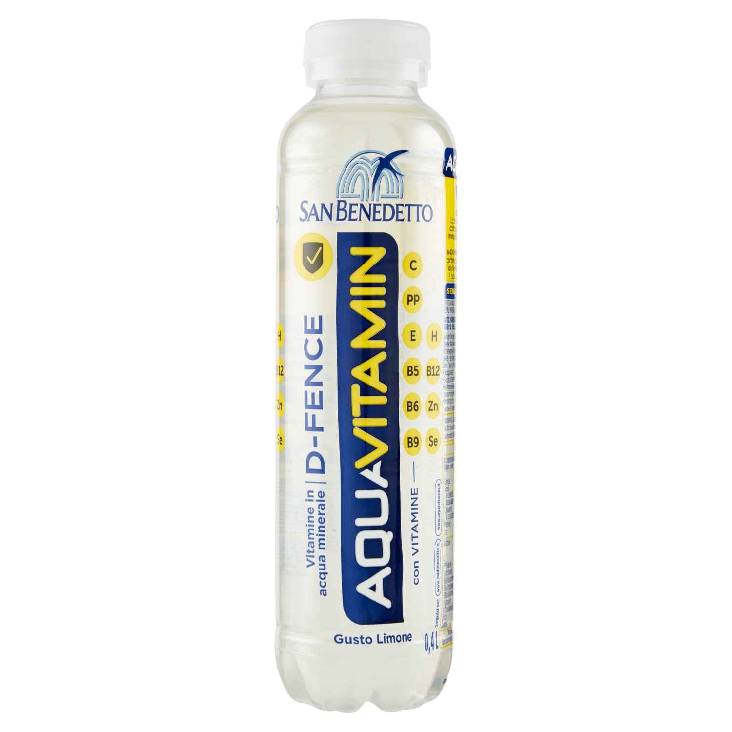 In 400 ml di Aquavitamin D-Fence trovi un alto contenuto di vitamina C, il 20% del valore nutrizionale di riferimento di vitamine PP, E, B5, B6, B9, H, B12, il tutto in una piacevole bevanda al gusto limone.
