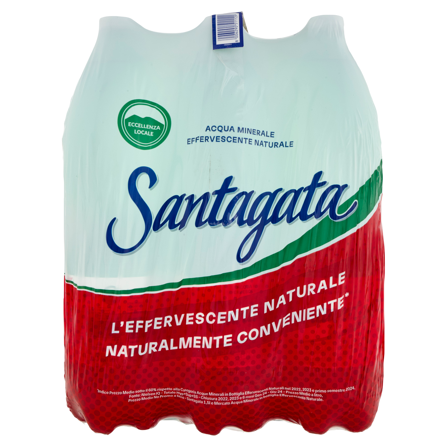 *Indice Prezzo Medio sotto il 60% rispetto alla Categoria Acque Minerali in Bottiglia Effervescenti Naturali nel 2022, 2023 e primo semestre 2024. Fonte: Nielsen IQ - Totale Hyp+Sup+SS - Chiusura 2022, 2023 e 6 mesi Gen 24 - Giu 24 - Prezzo Medio a litro, Prezzo Medio No Promo a litro - Santagata 1,5l e Mercato Acqua Minerale in bottiglia Effervescente Naturale